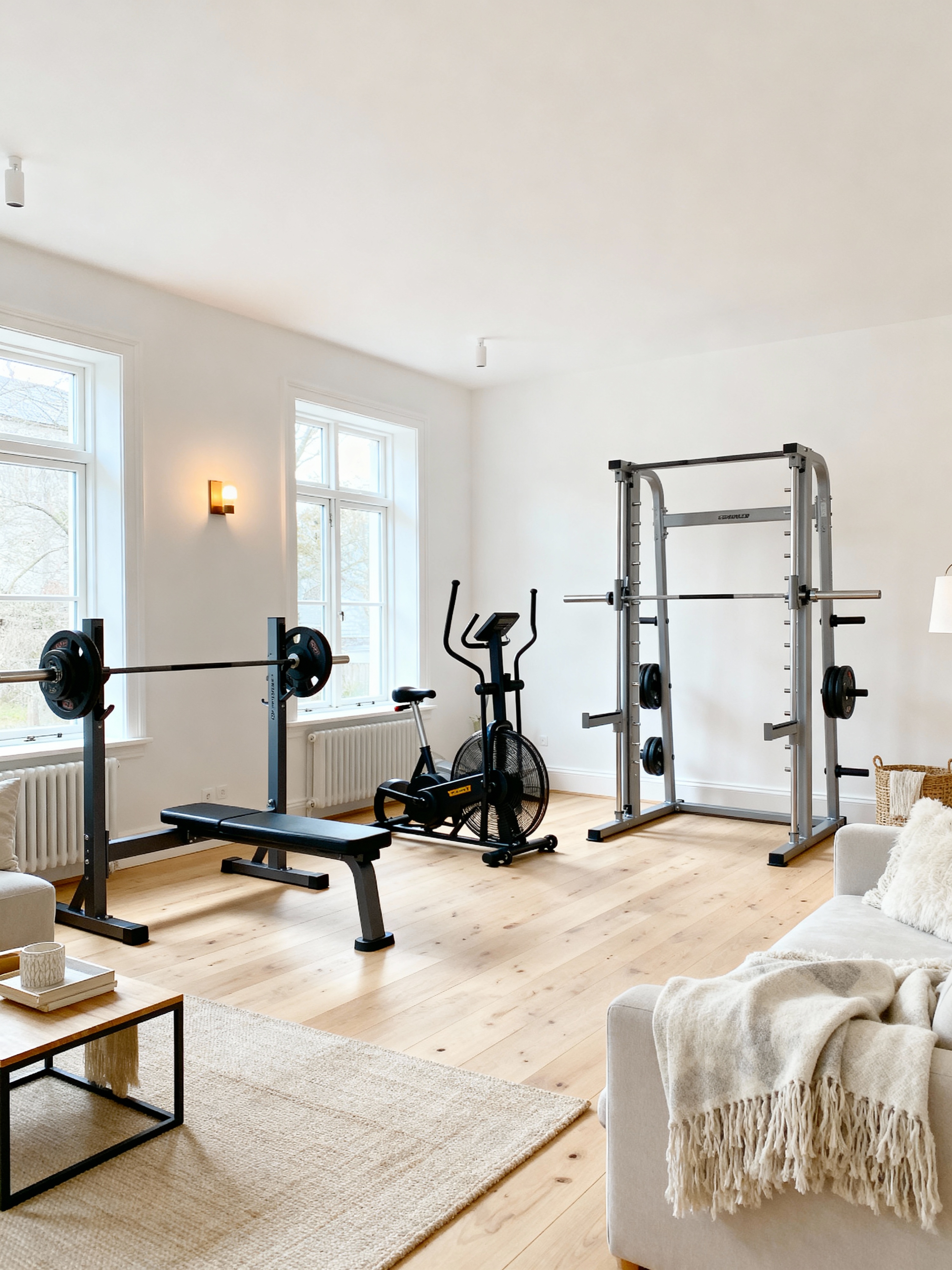fitness gym with scandinavian style with bench press and exercise bicycle and dumbbell stand and crosstrainer and squat rack and bench press. . with cozy atmosphere and functional furniture and white decor and natural light and light wood and hygge and clean lines and simple elegance