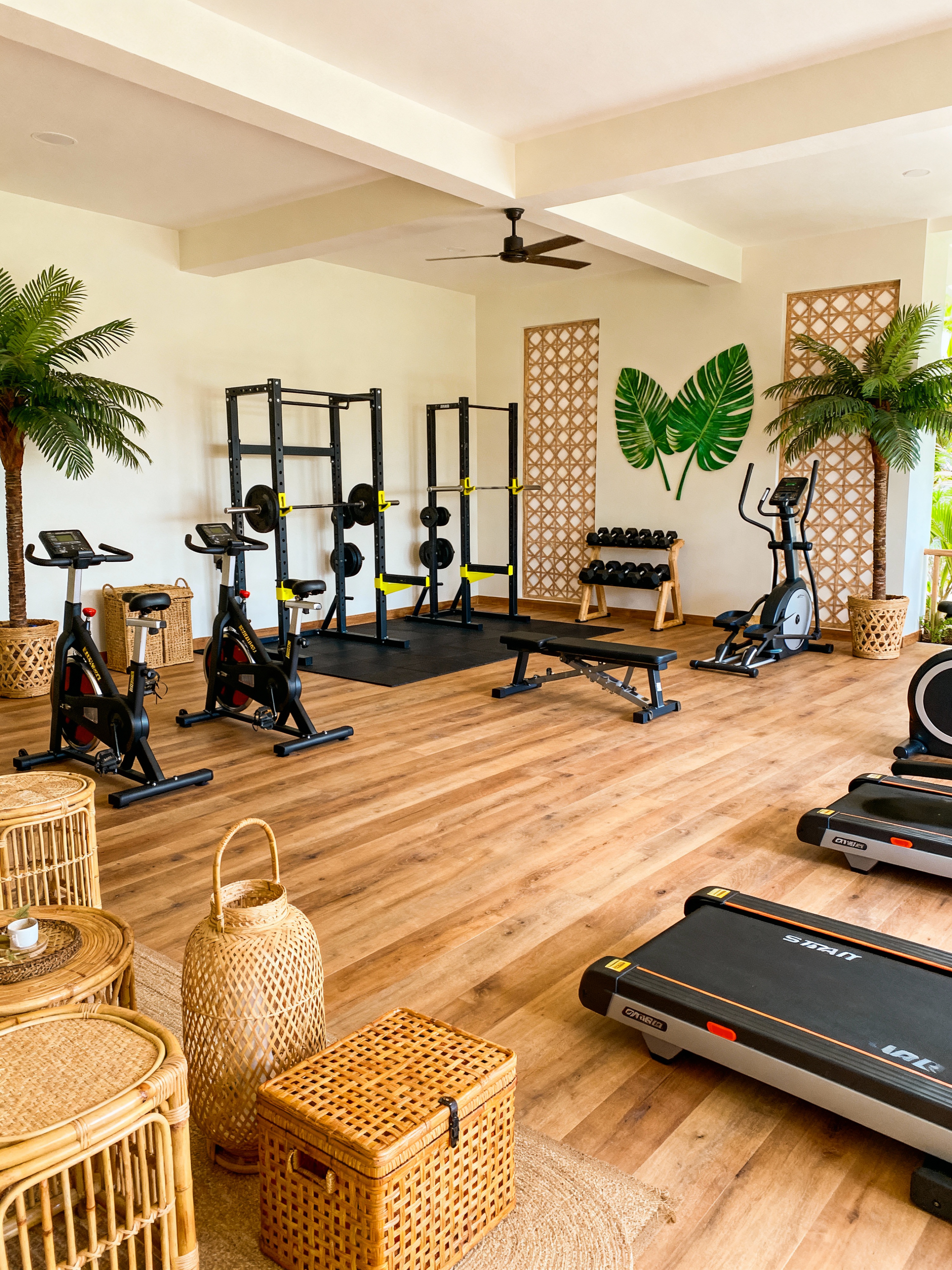 fitness gym with tropical style with exercise bicycle and squat rack and bench press and dumbbell stand and crosstrainer and exercise bicycle. . with cane motifs and bamboo and rattan and palm leaves and wicker and lattice prints and teak and palm trees