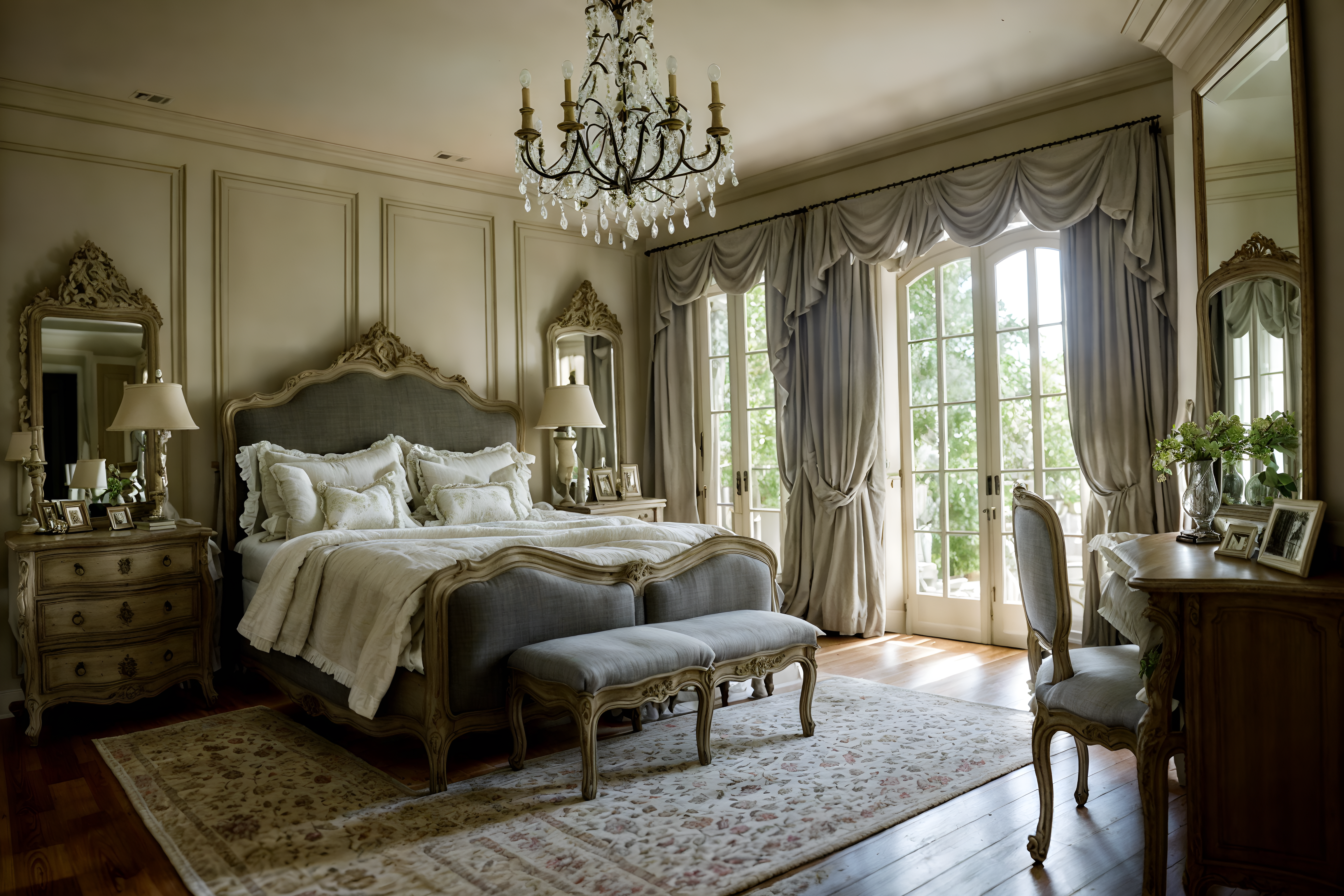 photo from pinterest of french country-style interior designed (bedroom interior) with dresser closet and bed and bedside table or night stand and plant and headboard and accent chair and storage bench or ottoman and mirror. . with . . cinematic photo, highly detailed, cinematic lighting, ultra-detailed, ultrarealistic, photorealism, 8k. trending on pinterest. french country interior design style. masterpiece, cinematic light, ultrarealistic+, photorealistic+, 8k, raw photo, realistic, sharp focus on eyes, (symmetrical eyes), (intact eyes), hyperrealistic, highest quality, best quality, , highly detailed, masterpiece, best quality, extremely detailed 8k wallpaper, masterpiece, best quality, ultra-detailed, best shadow, detailed background, detailed face, detailed eyes, high contrast, best illumination, detailed face, dulux, caustic, dynamic angle, detailed glow. dramatic lighting. highly detailed, insanely detailed hair, symmetrical, intricate details, professionally retouched, 8k high definition. strong bokeh. award winning photo.