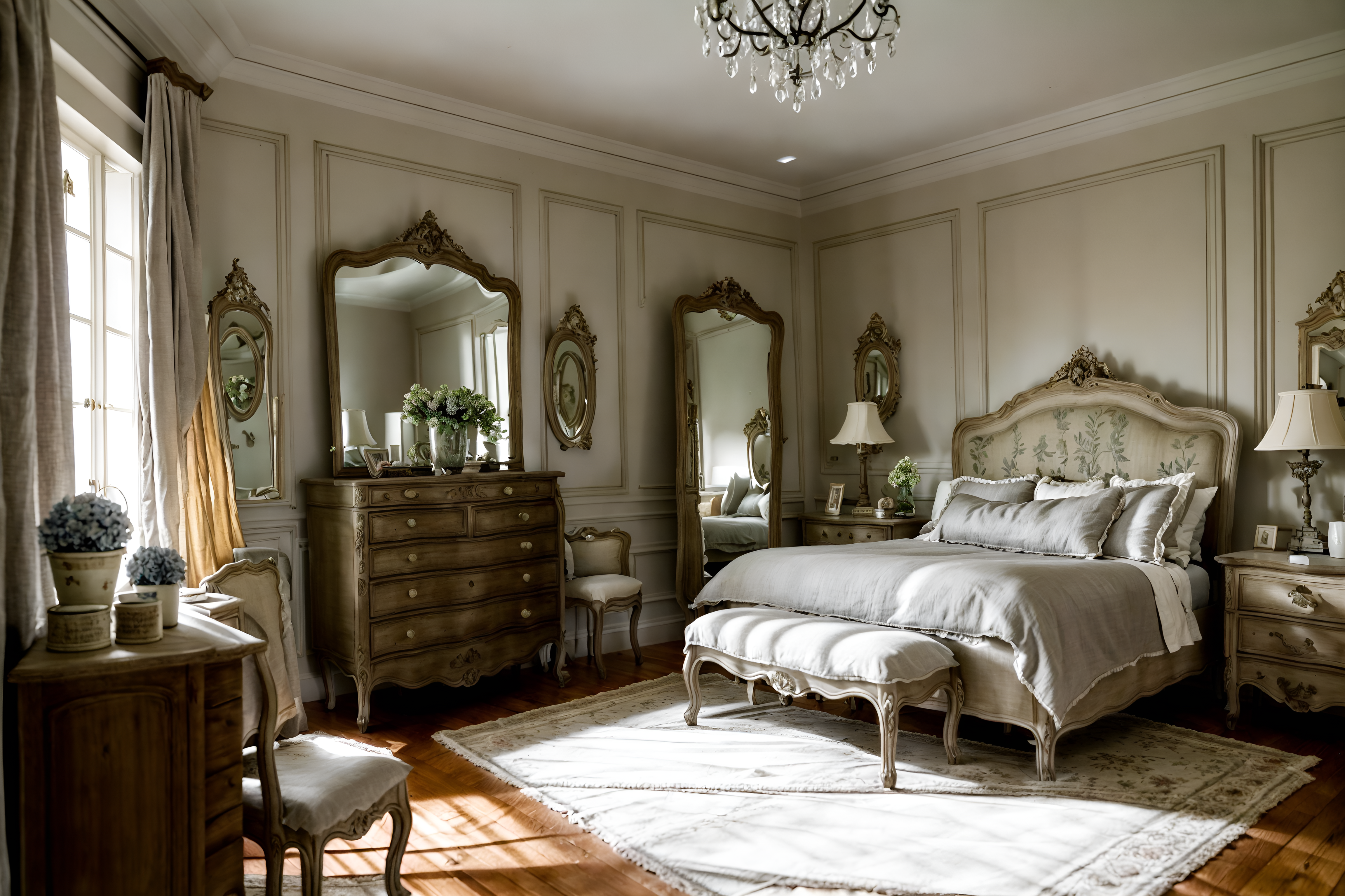 photo from pinterest of french country-style interior designed (bedroom interior) with dresser closet and bed and bedside table or night stand and plant and headboard and accent chair and storage bench or ottoman and mirror. . with . . cinematic photo, highly detailed, cinematic lighting, ultra-detailed, ultrarealistic, photorealism, 8k. trending on pinterest. french country interior design style. masterpiece, cinematic light, ultrarealistic+, photorealistic+, 8k, raw photo, realistic, sharp focus on eyes, (symmetrical eyes), (intact eyes), hyperrealistic, highest quality, best quality, , highly detailed, masterpiece, best quality, extremely detailed 8k wallpaper, masterpiece, best quality, ultra-detailed, best shadow, detailed background, detailed face, detailed eyes, high contrast, best illumination, detailed face, dulux, caustic, dynamic angle, detailed glow. dramatic lighting. highly detailed, insanely detailed hair, symmetrical, intricate details, professionally retouched, 8k high definition. strong bokeh. award winning photo.