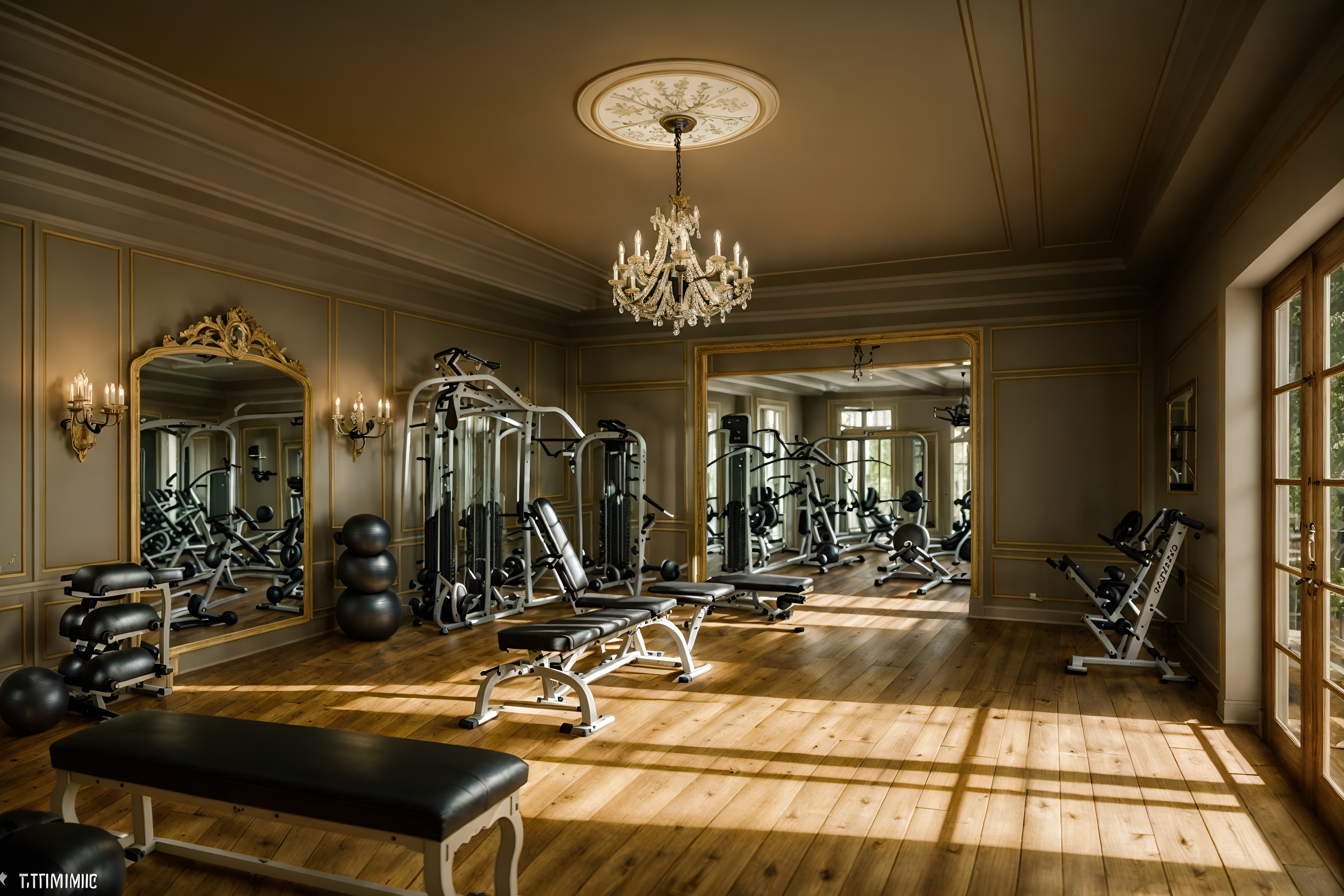 photo from pinterest of french country-style interior designed (fitness gym interior) with exercise bicycle and bench press and crosstrainer and squat rack and dumbbell stand and exercise bicycle. . with . . cinematic photo, highly detailed, cinematic lighting, ultra-detailed, ultrarealistic, photorealism, 8k. trending on pinterest. french country interior design style. masterpiece, cinematic light, ultrarealistic+, photorealistic+, 8k, raw photo, realistic, sharp focus on eyes, (symmetrical eyes), (intact eyes), hyperrealistic, highest quality, best quality, , highly detailed, masterpiece, best quality, extremely detailed 8k wallpaper, masterpiece, best quality, ultra-detailed, best shadow, detailed background, detailed face, detailed eyes, high contrast, best illumination, detailed face, dulux, caustic, dynamic angle, detailed glow. dramatic lighting. highly detailed, insanely detailed hair, symmetrical, intricate details, professionally retouched, 8k high definition. strong bokeh. award winning photo.