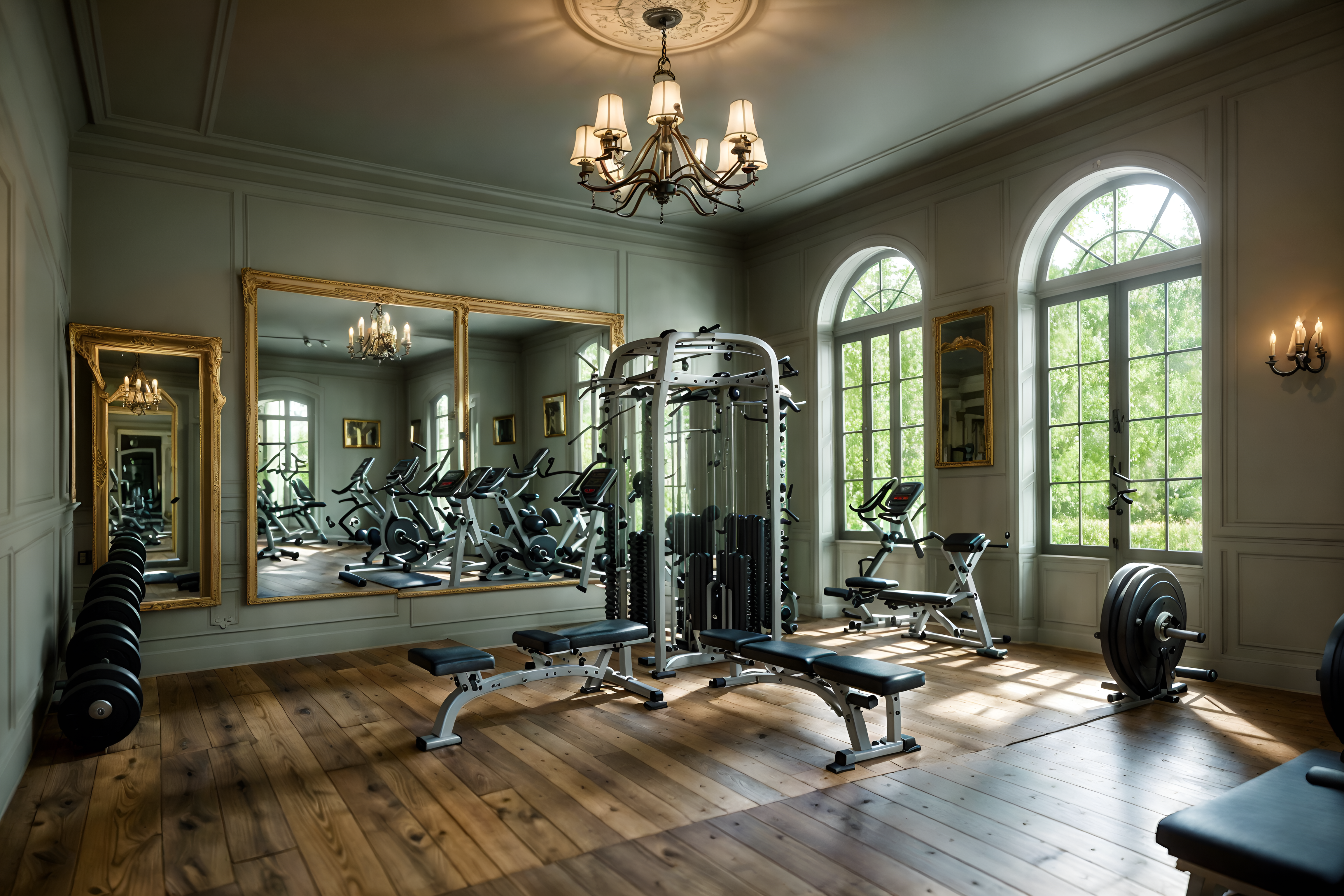 photo from pinterest of french country-style interior designed (fitness gym interior) with exercise bicycle and bench press and crosstrainer and squat rack and dumbbell stand and exercise bicycle. . with . . cinematic photo, highly detailed, cinematic lighting, ultra-detailed, ultrarealistic, photorealism, 8k. trending on pinterest. french country interior design style. masterpiece, cinematic light, ultrarealistic+, photorealistic+, 8k, raw photo, realistic, sharp focus on eyes, (symmetrical eyes), (intact eyes), hyperrealistic, highest quality, best quality, , highly detailed, masterpiece, best quality, extremely detailed 8k wallpaper, masterpiece, best quality, ultra-detailed, best shadow, detailed background, detailed face, detailed eyes, high contrast, best illumination, detailed face, dulux, caustic, dynamic angle, detailed glow. dramatic lighting. highly detailed, insanely detailed hair, symmetrical, intricate details, professionally retouched, 8k high definition. strong bokeh. award winning photo.