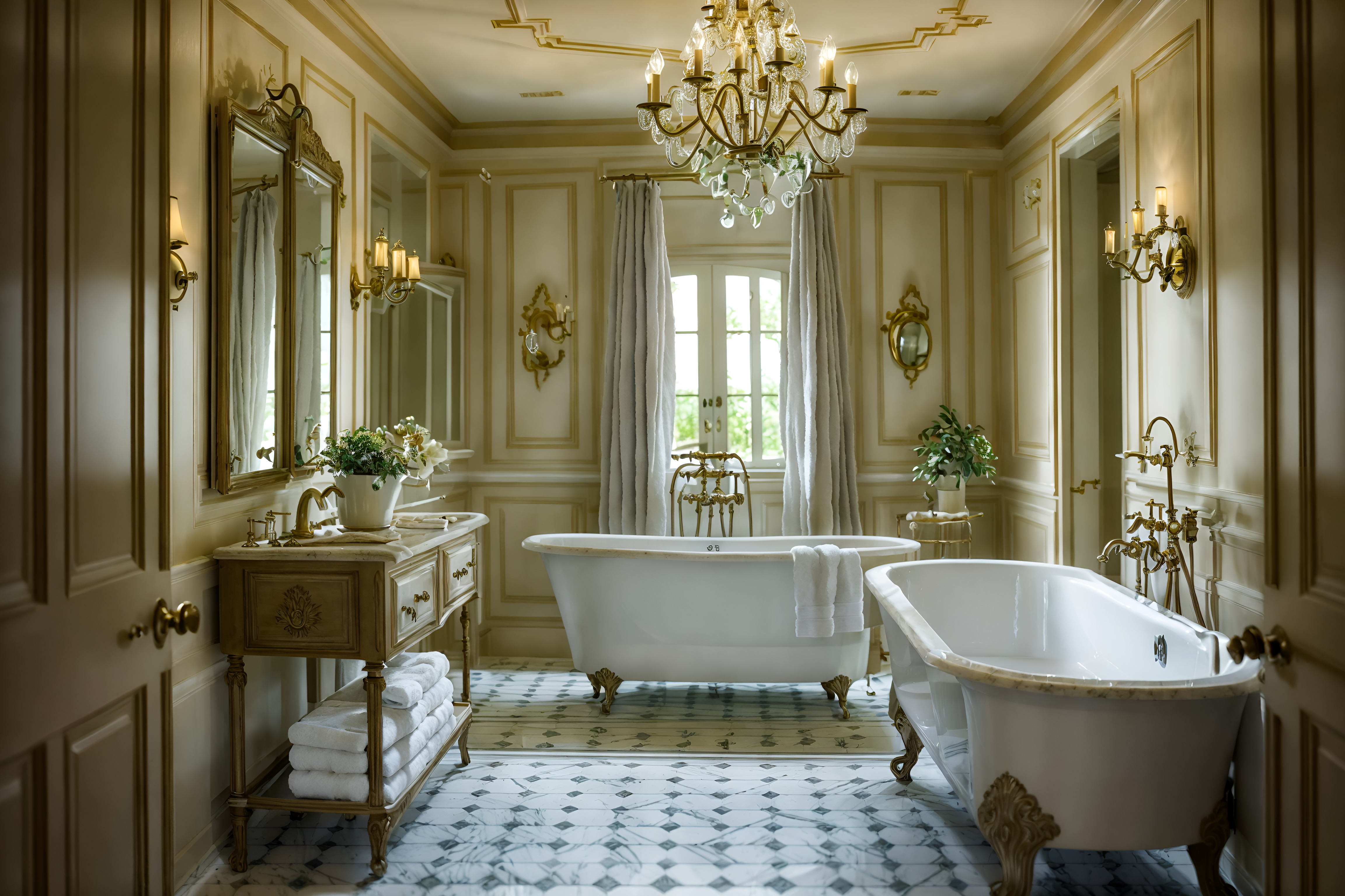 photo from pinterest of french country-style interior designed (hotel bathroom interior) with shower and bathtub and bathroom sink with faucet and waste basket and mirror and bathroom cabinet and plant and toilet seat. . with . . cinematic photo, highly detailed, cinematic lighting, ultra-detailed, ultrarealistic, photorealism, 8k. trending on pinterest. french country interior design style. masterpiece, cinematic light, ultrarealistic+, photorealistic+, 8k, raw photo, realistic, sharp focus on eyes, (symmetrical eyes), (intact eyes), hyperrealistic, highest quality, best quality, , highly detailed, masterpiece, best quality, extremely detailed 8k wallpaper, masterpiece, best quality, ultra-detailed, best shadow, detailed background, detailed face, detailed eyes, high contrast, best illumination, detailed face, dulux, caustic, dynamic angle, detailed glow. dramatic lighting. highly detailed, insanely detailed hair, symmetrical, intricate details, professionally retouched, 8k high definition. strong bokeh. award winning photo.