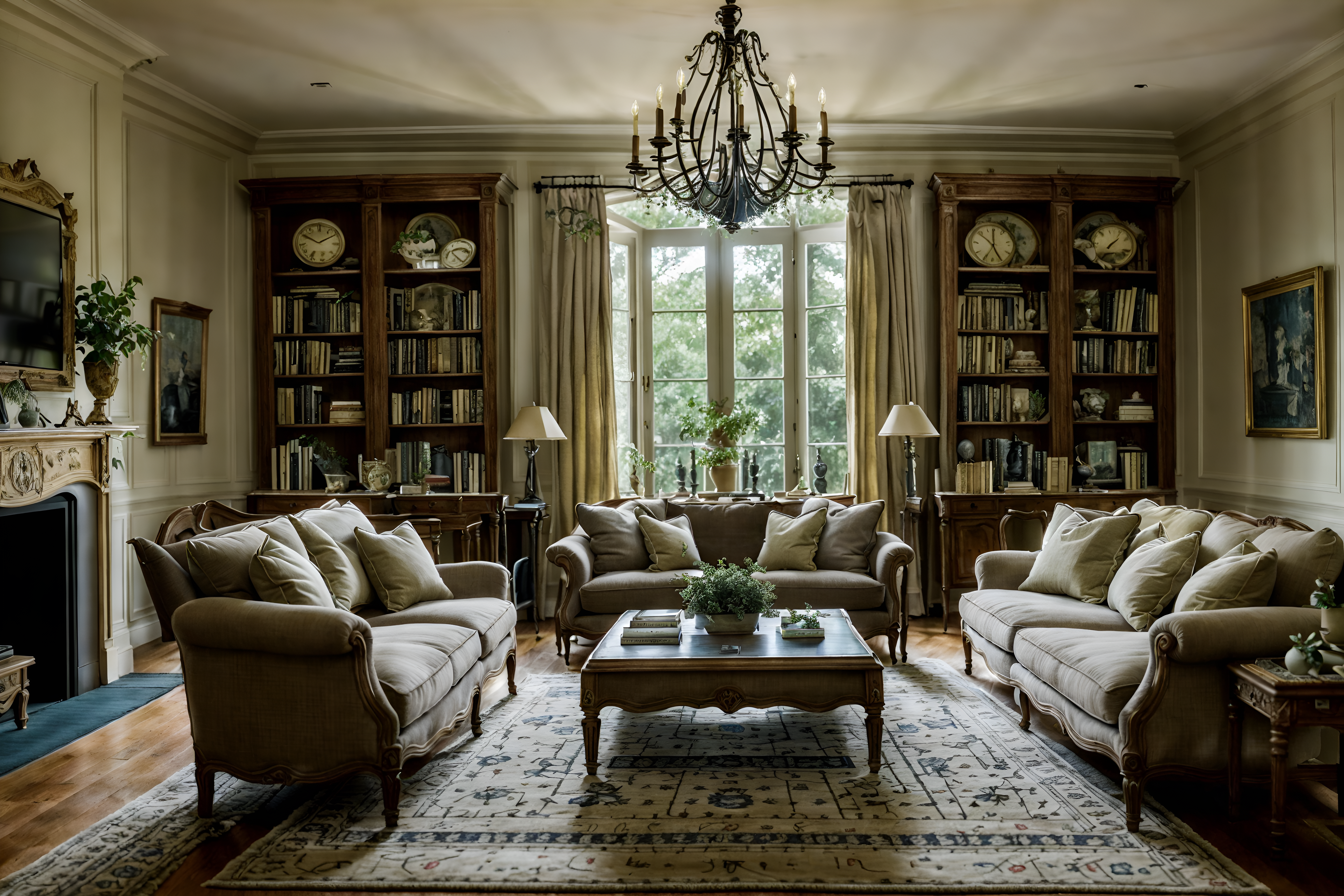 photo from pinterest of french country-style interior designed (living room interior) with occasional tables and plant and coffee tables and bookshelves and sofa and televisions and rug and chairs. . with . . cinematic photo, highly detailed, cinematic lighting, ultra-detailed, ultrarealistic, photorealism, 8k. trending on pinterest. french country interior design style. masterpiece, cinematic light, ultrarealistic+, photorealistic+, 8k, raw photo, realistic, sharp focus on eyes, (symmetrical eyes), (intact eyes), hyperrealistic, highest quality, best quality, , highly detailed, masterpiece, best quality, extremely detailed 8k wallpaper, masterpiece, best quality, ultra-detailed, best shadow, detailed background, detailed face, detailed eyes, high contrast, best illumination, detailed face, dulux, caustic, dynamic angle, detailed glow. dramatic lighting. highly detailed, insanely detailed hair, symmetrical, intricate details, professionally retouched, 8k high definition. strong bokeh. award winning photo.