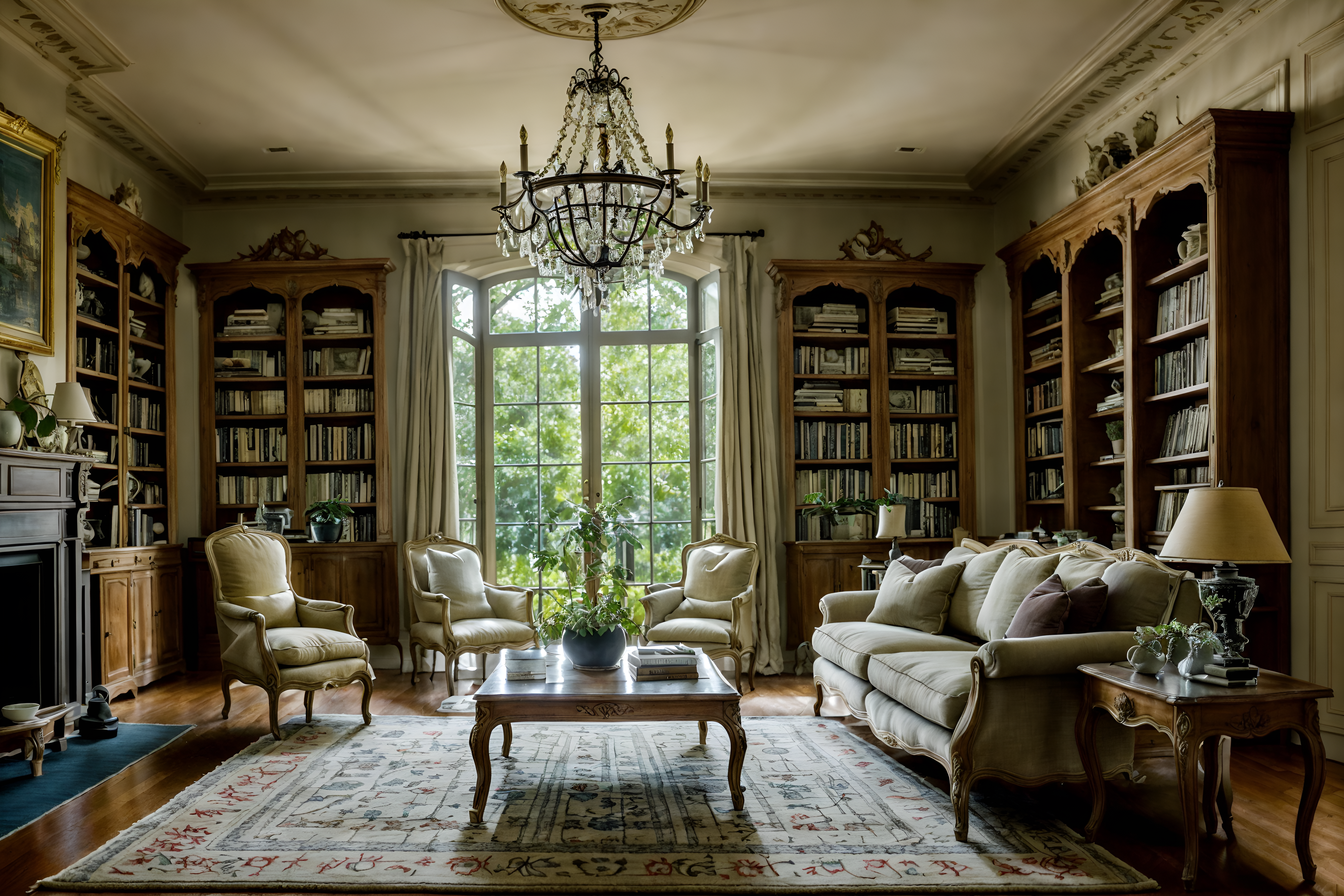 photo from pinterest of french country-style interior designed (living room interior) with occasional tables and plant and coffee tables and bookshelves and sofa and televisions and rug and chairs. . with . . cinematic photo, highly detailed, cinematic lighting, ultra-detailed, ultrarealistic, photorealism, 8k. trending on pinterest. french country interior design style. masterpiece, cinematic light, ultrarealistic+, photorealistic+, 8k, raw photo, realistic, sharp focus on eyes, (symmetrical eyes), (intact eyes), hyperrealistic, highest quality, best quality, , highly detailed, masterpiece, best quality, extremely detailed 8k wallpaper, masterpiece, best quality, ultra-detailed, best shadow, detailed background, detailed face, detailed eyes, high contrast, best illumination, detailed face, dulux, caustic, dynamic angle, detailed glow. dramatic lighting. highly detailed, insanely detailed hair, symmetrical, intricate details, professionally retouched, 8k high definition. strong bokeh. award winning photo.