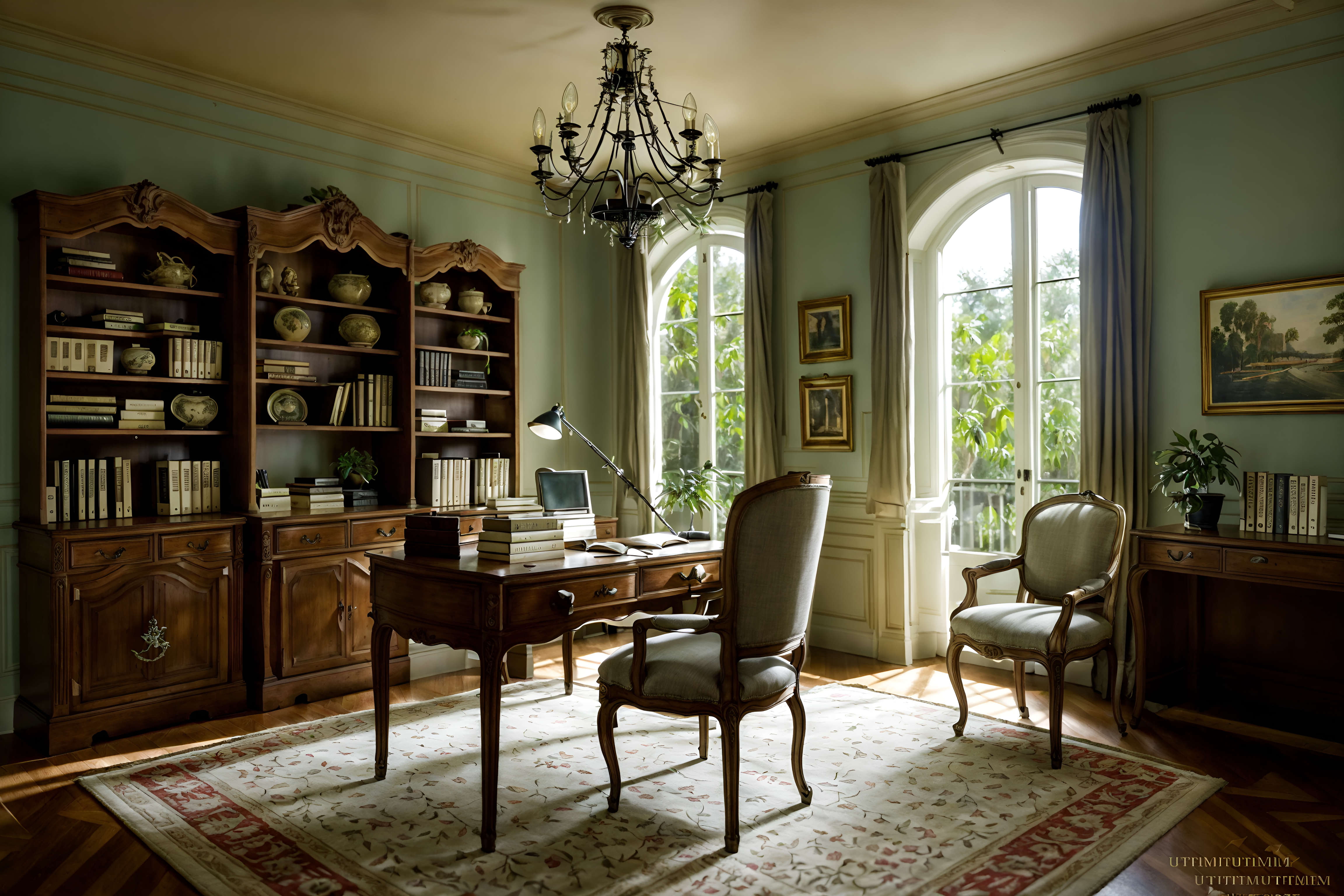 photo from pinterest of french country-style interior designed (study room interior) with office chair and plant and writing desk and cabinets and desk lamp and bookshelves and lounge chair and office chair. . with . . cinematic photo, highly detailed, cinematic lighting, ultra-detailed, ultrarealistic, photorealism, 8k. trending on pinterest. french country interior design style. masterpiece, cinematic light, ultrarealistic+, photorealistic+, 8k, raw photo, realistic, sharp focus on eyes, (symmetrical eyes), (intact eyes), hyperrealistic, highest quality, best quality, , highly detailed, masterpiece, best quality, extremely detailed 8k wallpaper, masterpiece, best quality, ultra-detailed, best shadow, detailed background, detailed face, detailed eyes, high contrast, best illumination, detailed face, dulux, caustic, dynamic angle, detailed glow. dramatic lighting. highly detailed, insanely detailed hair, symmetrical, intricate details, professionally retouched, 8k high definition. strong bokeh. award winning photo.