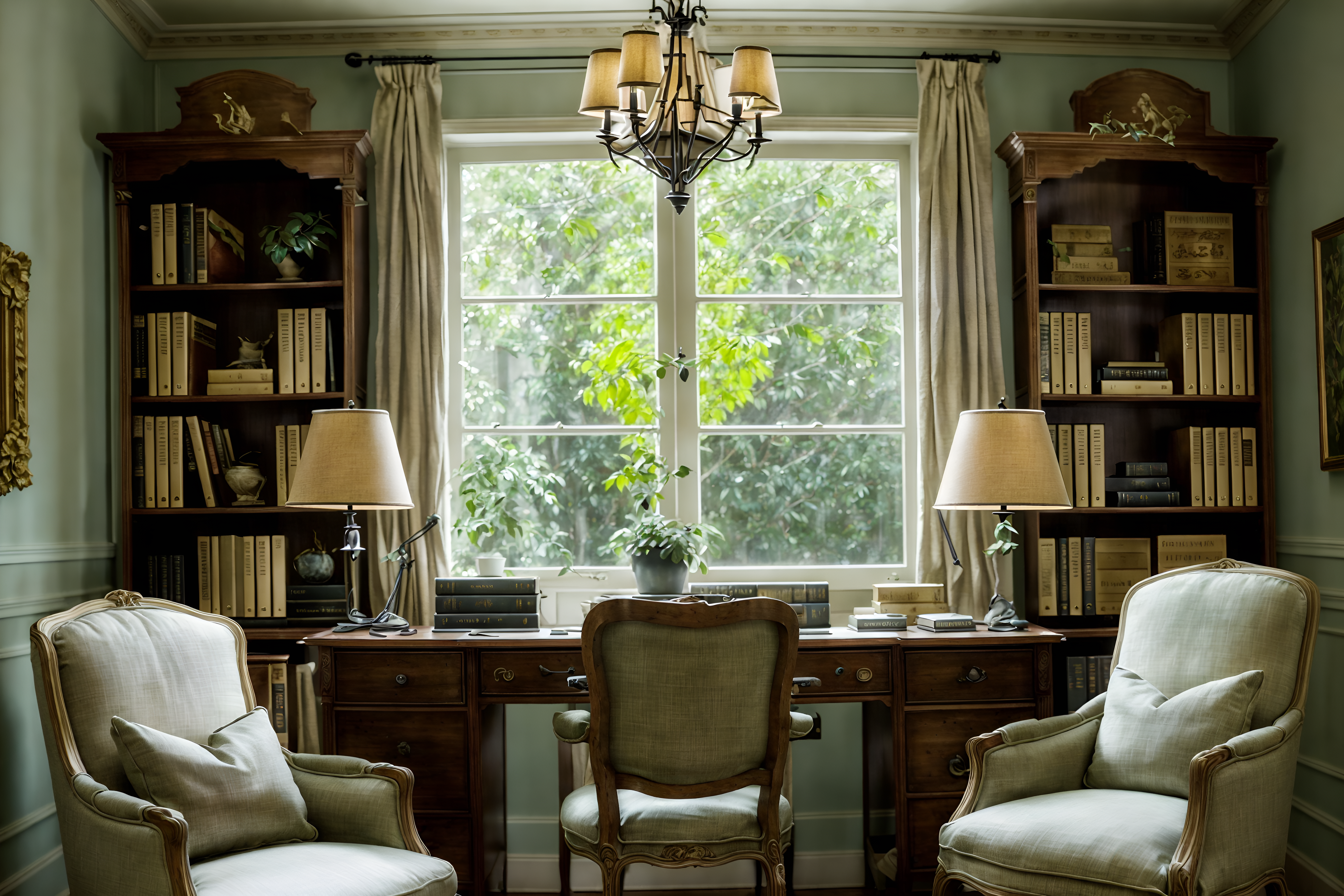 photo from pinterest of french country-style interior designed (study room interior) with office chair and plant and writing desk and cabinets and desk lamp and bookshelves and lounge chair and office chair. . with . . cinematic photo, highly detailed, cinematic lighting, ultra-detailed, ultrarealistic, photorealism, 8k. trending on pinterest. french country interior design style. masterpiece, cinematic light, ultrarealistic+, photorealistic+, 8k, raw photo, realistic, sharp focus on eyes, (symmetrical eyes), (intact eyes), hyperrealistic, highest quality, best quality, , highly detailed, masterpiece, best quality, extremely detailed 8k wallpaper, masterpiece, best quality, ultra-detailed, best shadow, detailed background, detailed face, detailed eyes, high contrast, best illumination, detailed face, dulux, caustic, dynamic angle, detailed glow. dramatic lighting. highly detailed, insanely detailed hair, symmetrical, intricate details, professionally retouched, 8k high definition. strong bokeh. award winning photo.