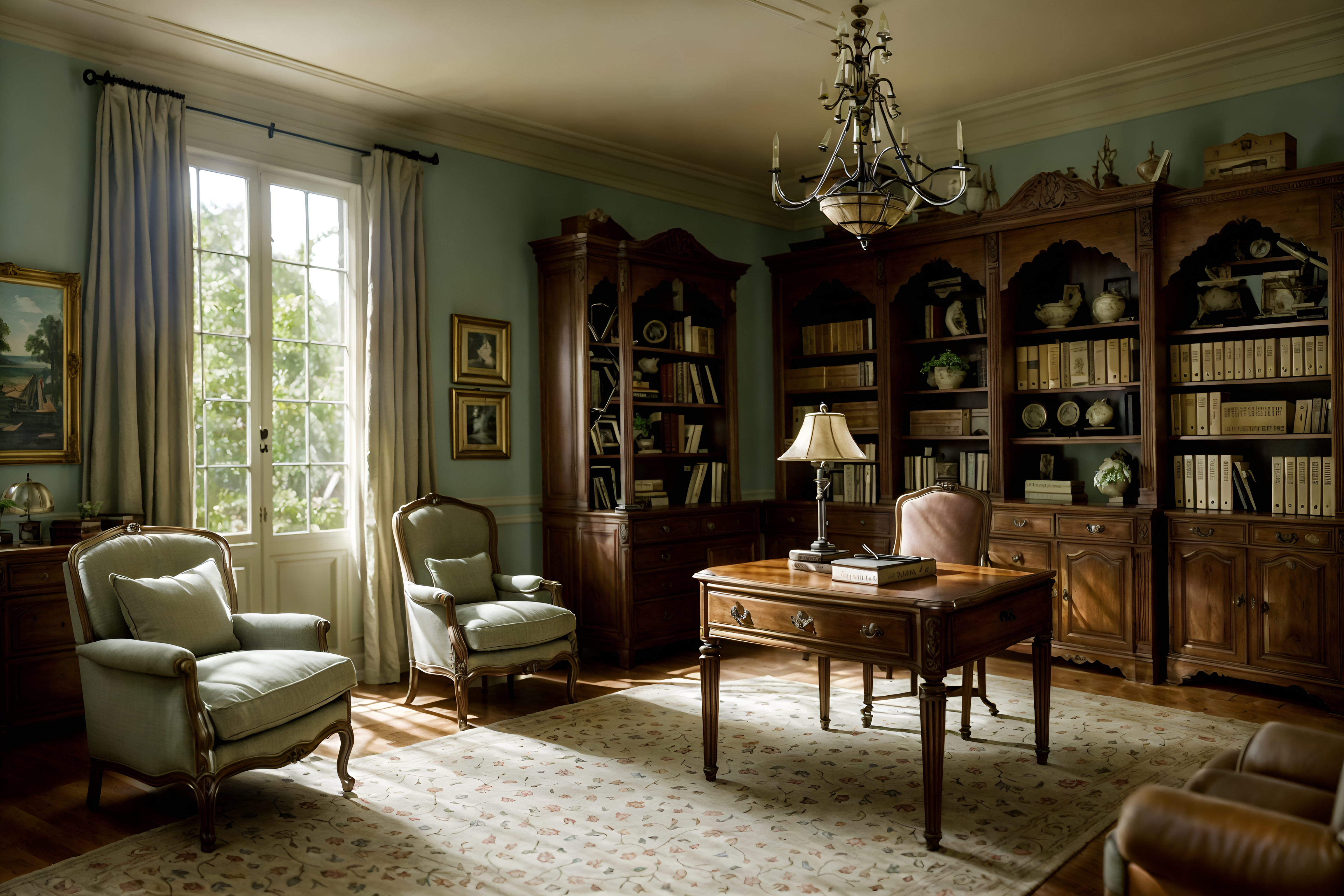 photo from pinterest of french country-style interior designed (study room interior) with office chair and plant and writing desk and cabinets and desk lamp and bookshelves and lounge chair and office chair. . with . . cinematic photo, highly detailed, cinematic lighting, ultra-detailed, ultrarealistic, photorealism, 8k. trending on pinterest. french country interior design style. masterpiece, cinematic light, ultrarealistic+, photorealistic+, 8k, raw photo, realistic, sharp focus on eyes, (symmetrical eyes), (intact eyes), hyperrealistic, highest quality, best quality, , highly detailed, masterpiece, best quality, extremely detailed 8k wallpaper, masterpiece, best quality, ultra-detailed, best shadow, detailed background, detailed face, detailed eyes, high contrast, best illumination, detailed face, dulux, caustic, dynamic angle, detailed glow. dramatic lighting. highly detailed, insanely detailed hair, symmetrical, intricate details, professionally retouched, 8k high definition. strong bokeh. award winning photo.