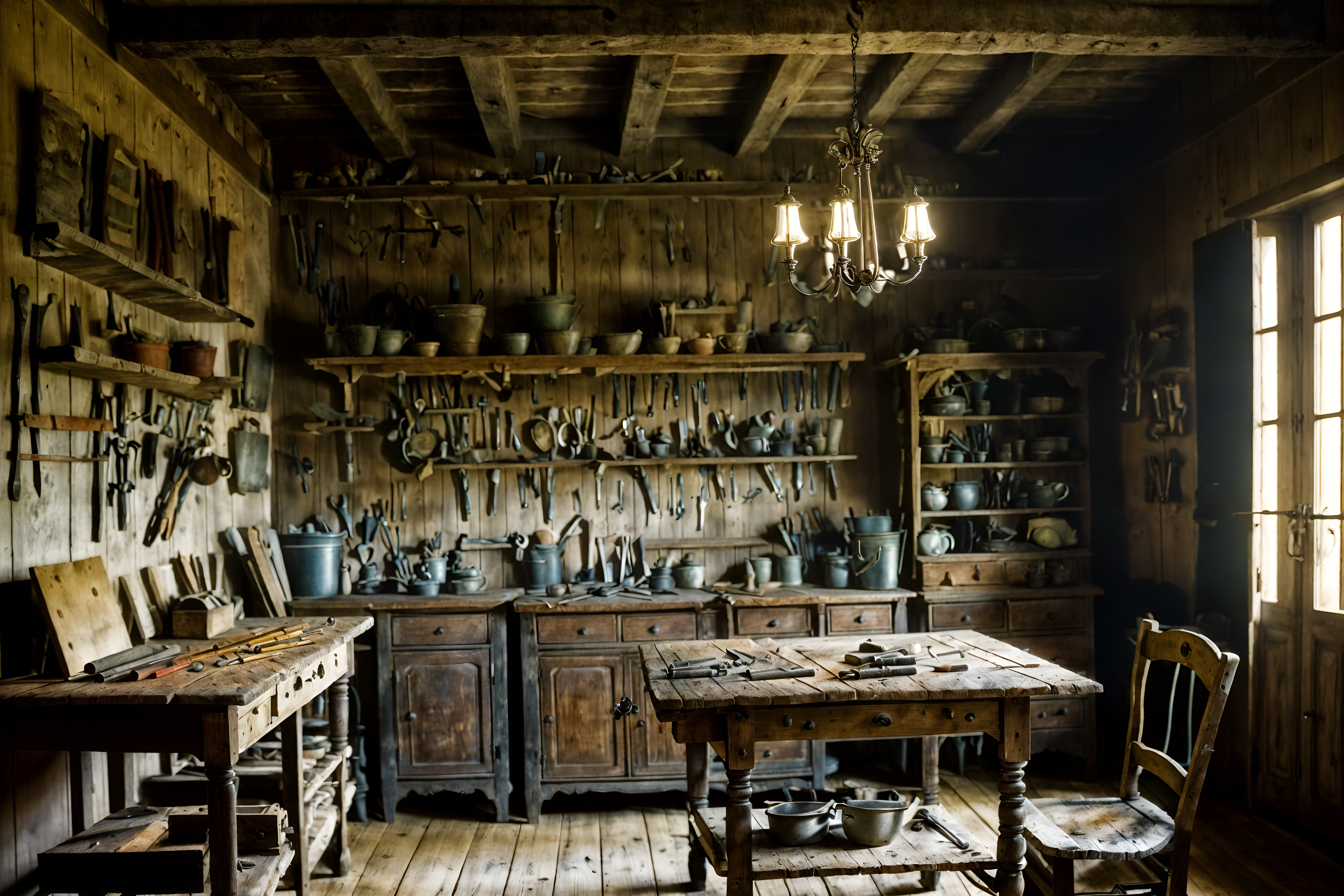 photo from pinterest of french country-style interior designed (workshop interior) with wooden workbench and messy and tool wall and wooden workbench. . with . . cinematic photo, highly detailed, cinematic lighting, ultra-detailed, ultrarealistic, photorealism, 8k. trending on pinterest. french country interior design style. masterpiece, cinematic light, ultrarealistic+, photorealistic+, 8k, raw photo, realistic, sharp focus on eyes, (symmetrical eyes), (intact eyes), hyperrealistic, highest quality, best quality, , highly detailed, masterpiece, best quality, extremely detailed 8k wallpaper, masterpiece, best quality, ultra-detailed, best shadow, detailed background, detailed face, detailed eyes, high contrast, best illumination, detailed face, dulux, caustic, dynamic angle, detailed glow. dramatic lighting. highly detailed, insanely detailed hair, symmetrical, intricate details, professionally retouched, 8k high definition. strong bokeh. award winning photo.
