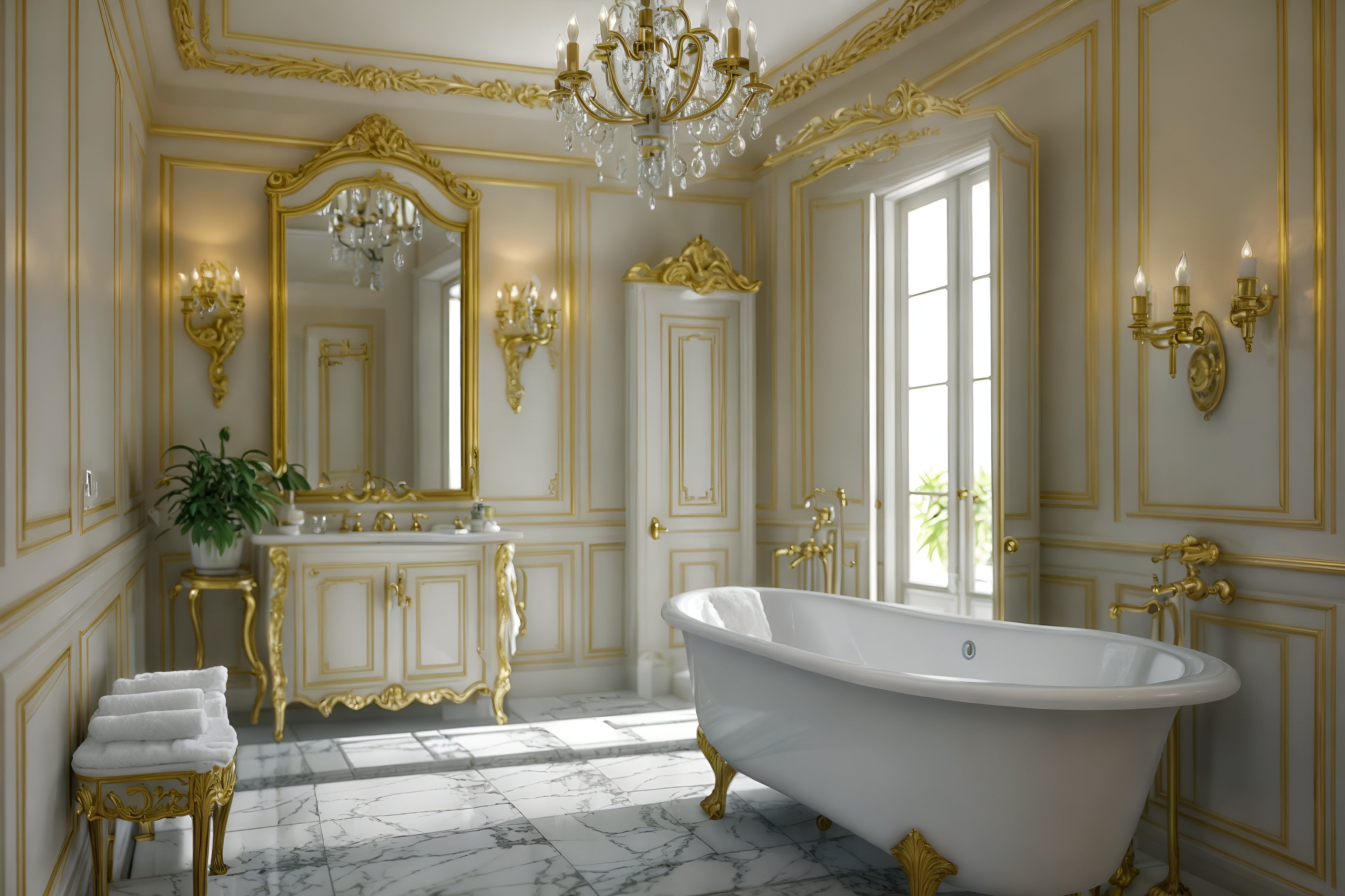 photo from pinterest of french-style interior designed (bathroom interior) with bath rail and bathroom cabinet and plant and bathtub and toilet seat and mirror and waste basket and bathroom sink with faucet cinematic photo, highly detailed, cinematic lighting, ultra-detailed, ultrarealistic, photorealism, 8k. trending on pinterest. french interior design style. masterpiece, cinematic light, ultrarealistic+, photorealistic+, 8k, raw photo, realistic, sharp focus on eyes, (symmetrical eyes), (intact eyes), hyperrealistic, highest quality, best quality, , highly detailed, masterpiece, best quality, extremely detailed 8k wallpaper, masterpiece, best quality, ultra-detailed, best shadow, detailed background, detailed face, detailed eyes, high contrast, best illumination, detailed face, dulux, caustic, dynamic angle, detailed glow. dramatic lighting. highly detailed, insanely detailed hair, symmetrical, intricate details, professionally retouched, 8k high definition. strong bokeh. award winning photo.