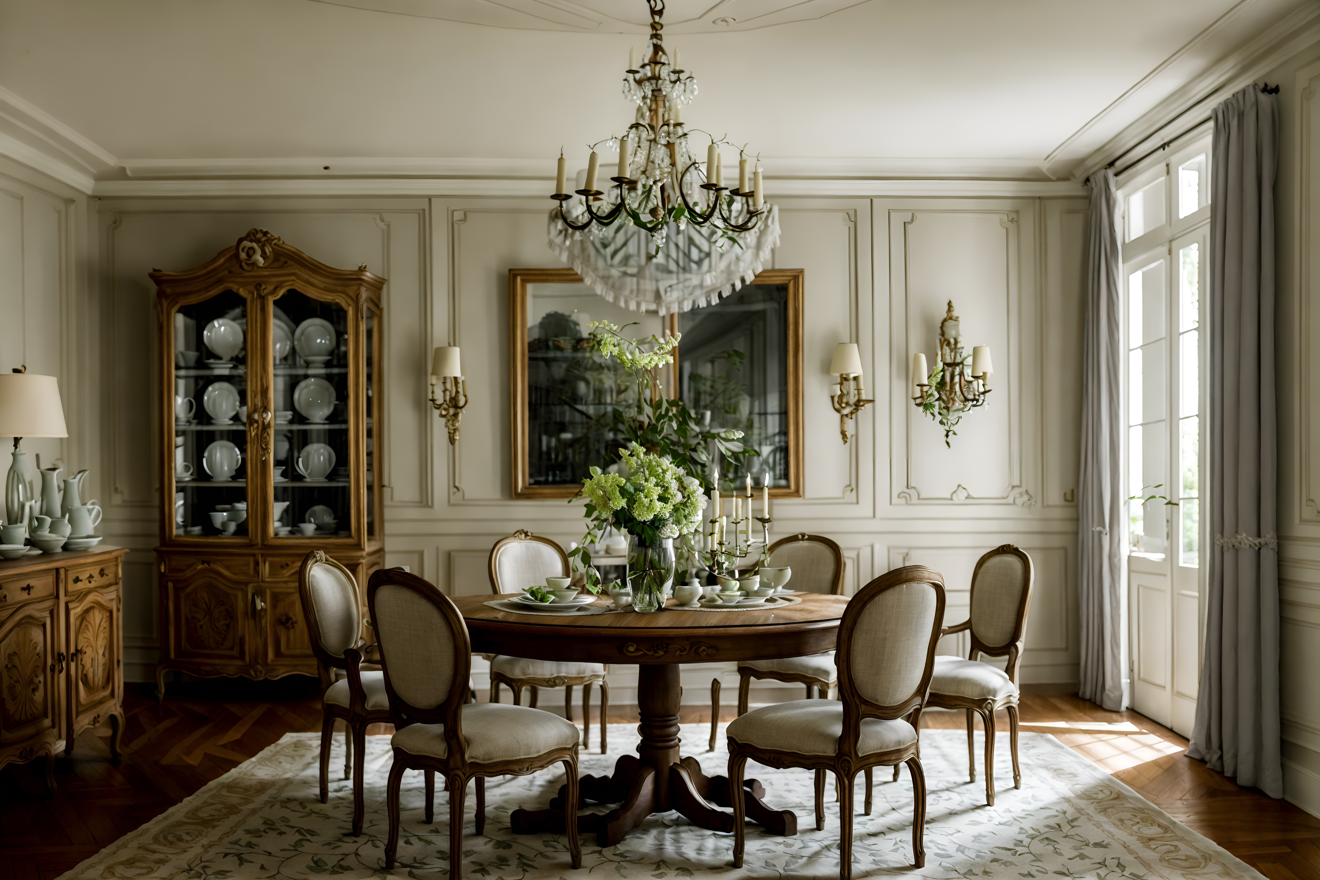 photo from pinterest of french-style interior designed (dining room interior) with dining table chairs and plant and table cloth and dining table and bookshelves and painting or photo on wall and vase and plates, cutlery and glasses on dining table cinematic photo, highly detailed, cinematic lighting, ultra-detailed, ultrarealistic, photorealism, 8k. trending on pinterest. french interior design style. masterpiece, cinematic light, ultrarealistic+, photorealistic+, 8k, raw photo, realistic, sharp focus on eyes, (symmetrical eyes), (intact eyes), hyperrealistic, highest quality, best quality, , highly detailed, masterpiece, best quality, extremely detailed 8k wallpaper, masterpiece, best quality, ultra-detailed, best shadow, detailed background, detailed face, detailed eyes, high contrast, best illumination, detailed face, dulux, caustic, dynamic angle, detailed glow. dramatic lighting. highly detailed, insanely detailed hair, symmetrical, intricate details, professionally retouched, 8k high definition. strong bokeh. award winning photo.
