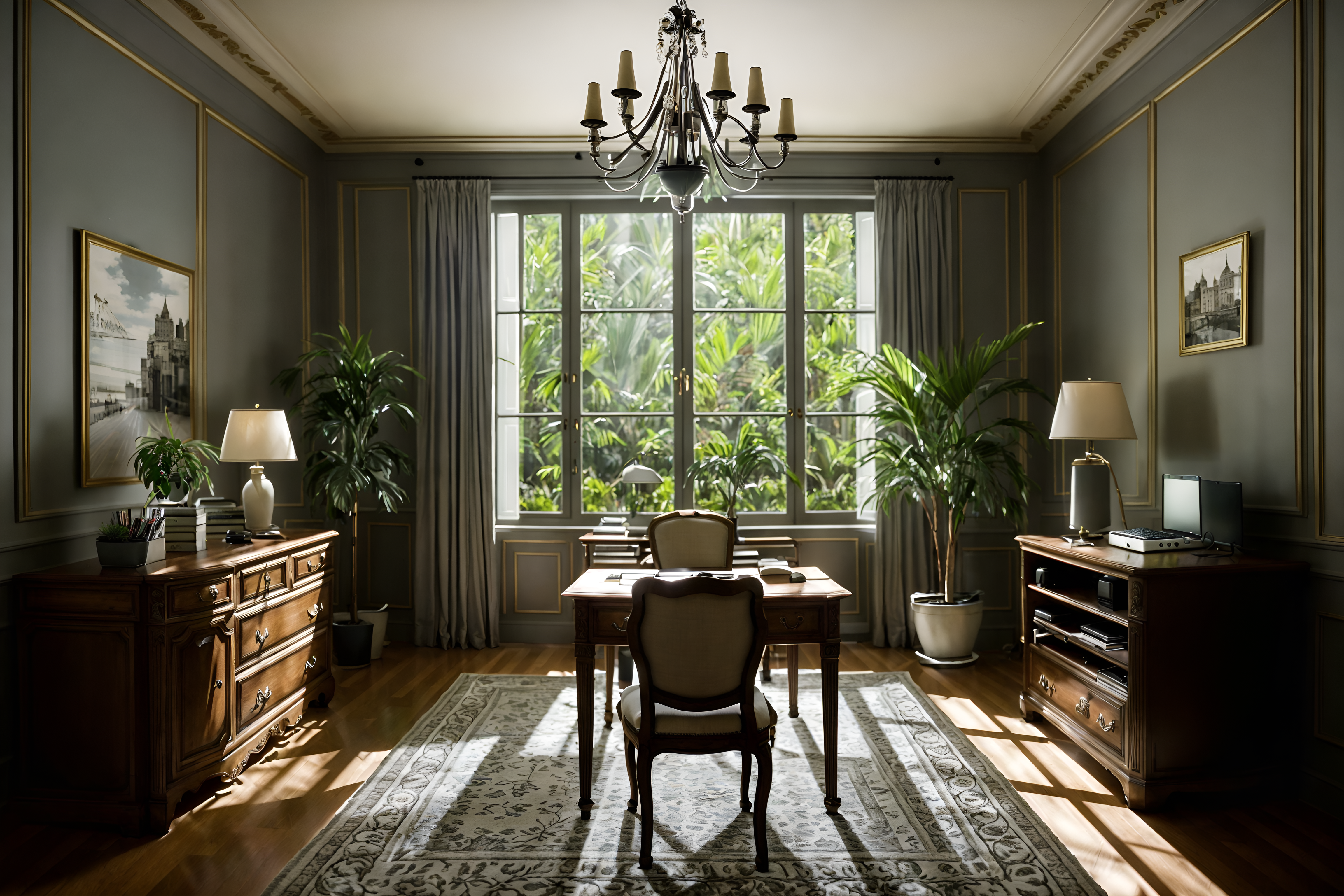 photo from pinterest of french-style interior designed (home office interior) with computer desk and office chair and plant and desk lamp and cabinets and computer desk cinematic photo, highly detailed, cinematic lighting, ultra-detailed, ultrarealistic, photorealism, 8k. trending on pinterest. french interior design style. masterpiece, cinematic light, ultrarealistic+, photorealistic+, 8k, raw photo, realistic, sharp focus on eyes, (symmetrical eyes), (intact eyes), hyperrealistic, highest quality, best quality, , highly detailed, masterpiece, best quality, extremely detailed 8k wallpaper, masterpiece, best quality, ultra-detailed, best shadow, detailed background, detailed face, detailed eyes, high contrast, best illumination, detailed face, dulux, caustic, dynamic angle, detailed glow. dramatic lighting. highly detailed, insanely detailed hair, symmetrical, intricate details, professionally retouched, 8k high definition. strong bokeh. award winning photo.