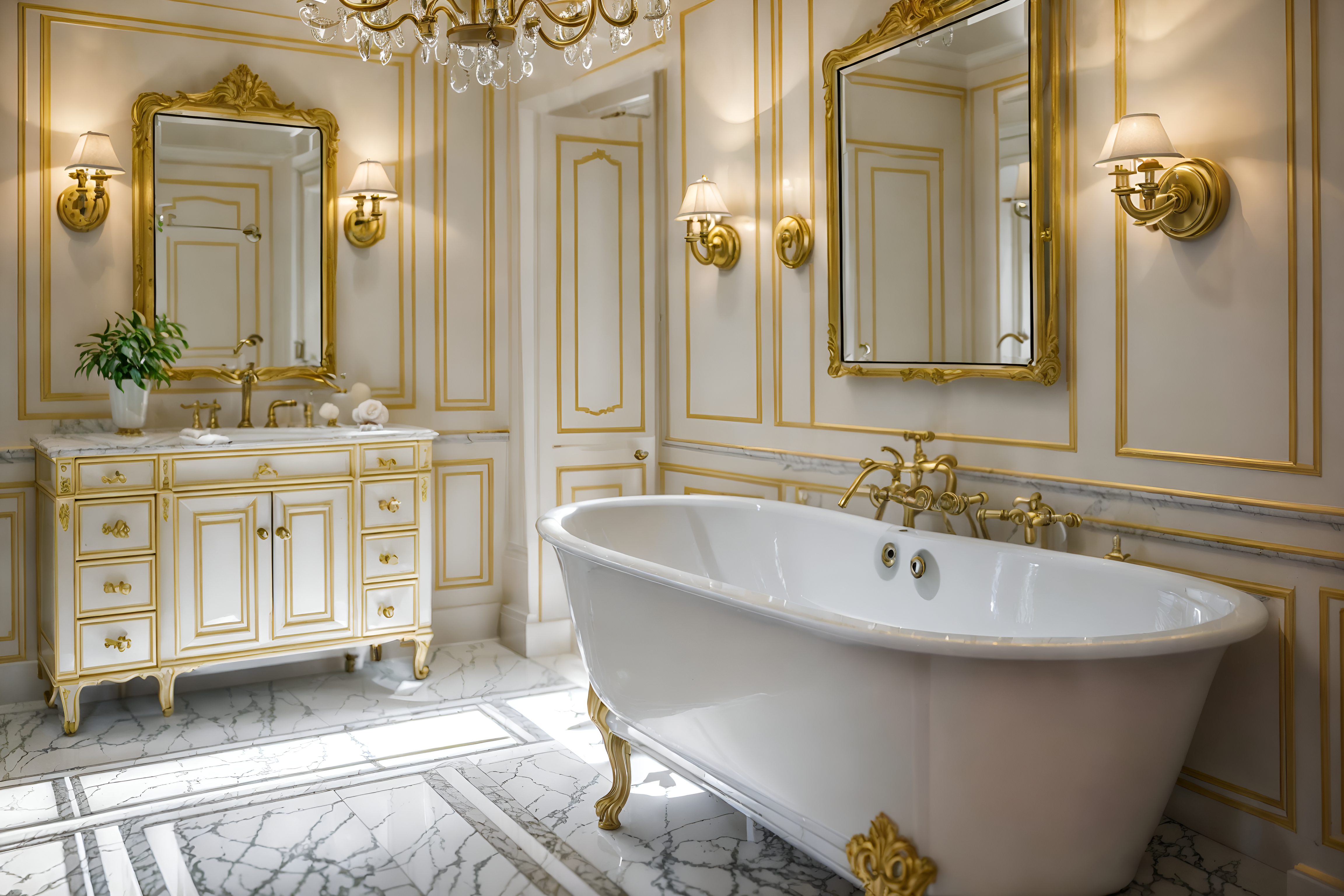 photo from pinterest of french-style interior designed (hotel bathroom interior) with waste basket and bathroom cabinet and plant and shower and toilet seat and mirror and bathroom sink with faucet and bathtub cinematic photo, highly detailed, cinematic lighting, ultra-detailed, ultrarealistic, photorealism, 8k. trending on pinterest. french interior design style. masterpiece, cinematic light, ultrarealistic+, photorealistic+, 8k, raw photo, realistic, sharp focus on eyes, (symmetrical eyes), (intact eyes), hyperrealistic, highest quality, best quality, , highly detailed, masterpiece, best quality, extremely detailed 8k wallpaper, masterpiece, best quality, ultra-detailed, best shadow, detailed background, detailed face, detailed eyes, high contrast, best illumination, detailed face, dulux, caustic, dynamic angle, detailed glow. dramatic lighting. highly detailed, insanely detailed hair, symmetrical, intricate details, professionally retouched, 8k high definition. strong bokeh. award winning photo.