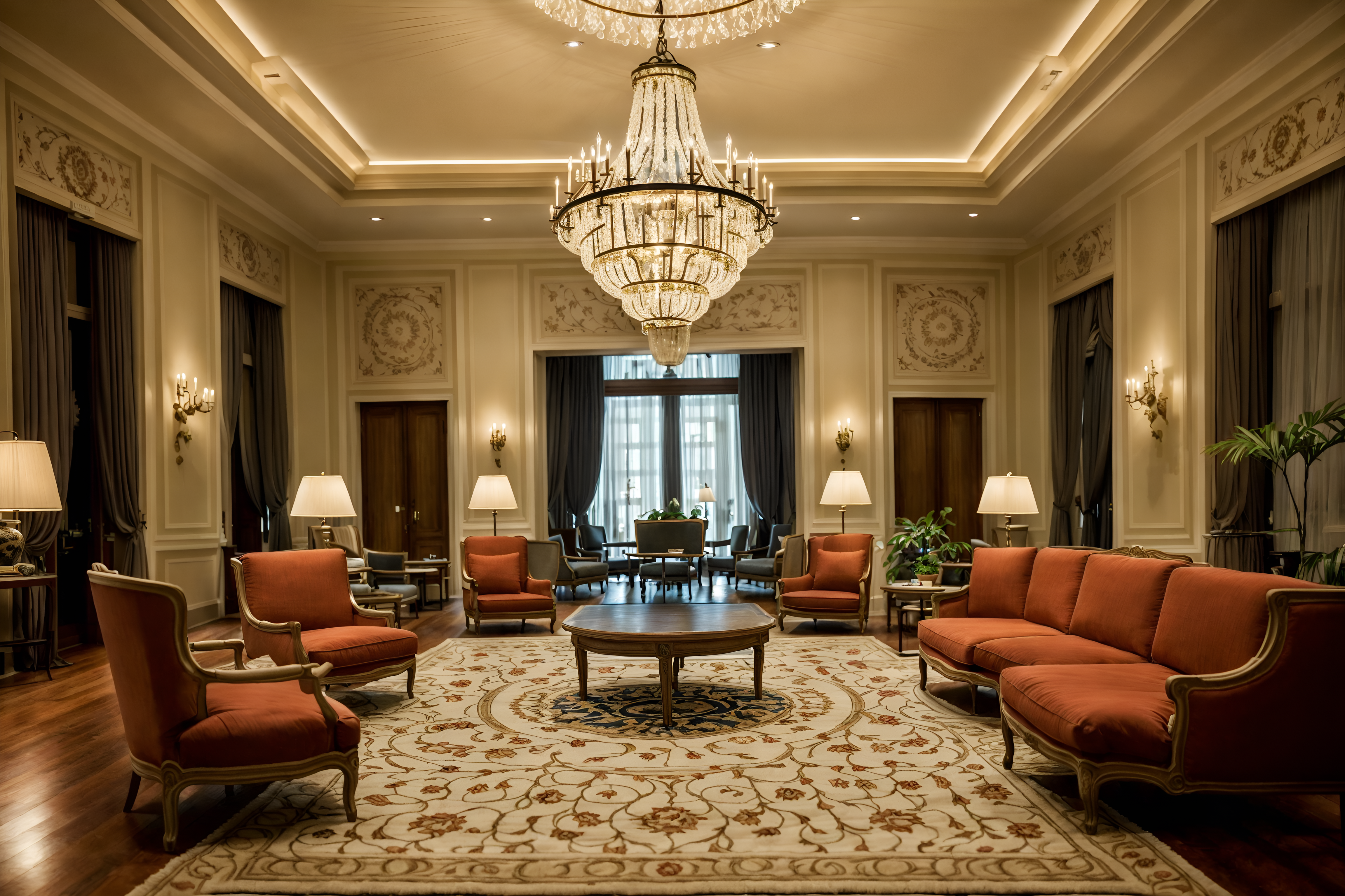 photo from pinterest of french-style interior designed (hotel lobby interior) with rug and hanging lamps and plant and furniture and sofas and lounge chairs and check in desk and coffee tables cinematic photo, highly detailed, cinematic lighting, ultra-detailed, ultrarealistic, photorealism, 8k. trending on pinterest. french interior design style. masterpiece, cinematic light, ultrarealistic+, photorealistic+, 8k, raw photo, realistic, sharp focus on eyes, (symmetrical eyes), (intact eyes), hyperrealistic, highest quality, best quality, , highly detailed, masterpiece, best quality, extremely detailed 8k wallpaper, masterpiece, best quality, ultra-detailed, best shadow, detailed background, detailed face, detailed eyes, high contrast, best illumination, detailed face, dulux, caustic, dynamic angle, detailed glow. dramatic lighting. highly detailed, insanely detailed hair, symmetrical, intricate details, professionally retouched, 8k high definition. strong bokeh. award winning photo.