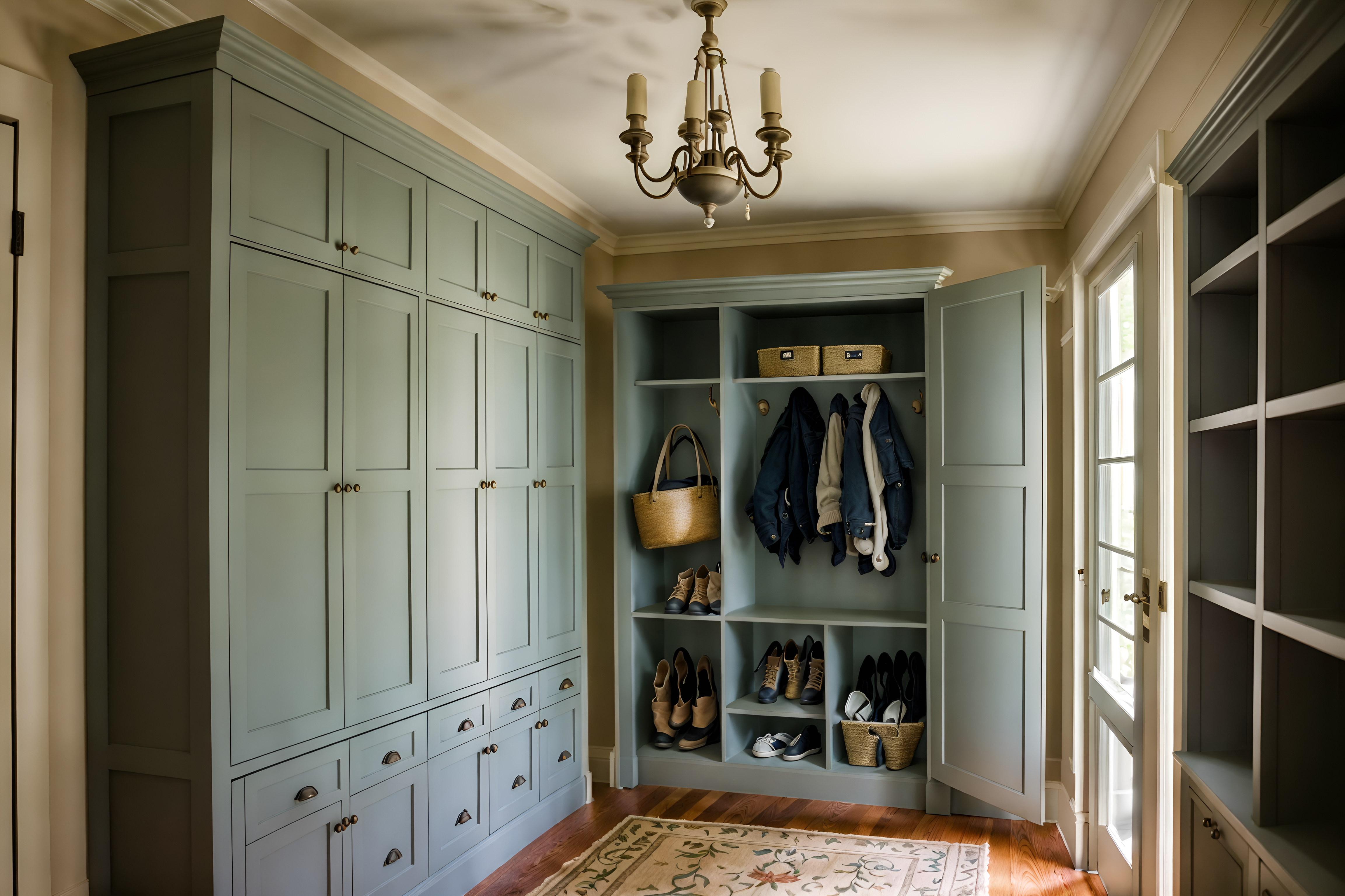 photo from pinterest of french-style interior designed (mudroom interior) with wall hooks for coats and high up storage and cubbies and a bench and cabinets and storage baskets and storage drawers and shelves for shoes cinematic photo, highly detailed, cinematic lighting, ultra-detailed, ultrarealistic, photorealism, 8k. trending on pinterest. french interior design style. masterpiece, cinematic light, ultrarealistic+, photorealistic+, 8k, raw photo, realistic, sharp focus on eyes, (symmetrical eyes), (intact eyes), hyperrealistic, highest quality, best quality, , highly detailed, masterpiece, best quality, extremely detailed 8k wallpaper, masterpiece, best quality, ultra-detailed, best shadow, detailed background, detailed face, detailed eyes, high contrast, best illumination, detailed face, dulux, caustic, dynamic angle, detailed glow. dramatic lighting. highly detailed, insanely detailed hair, symmetrical, intricate details, professionally retouched, 8k high definition. strong bokeh. award winning photo.