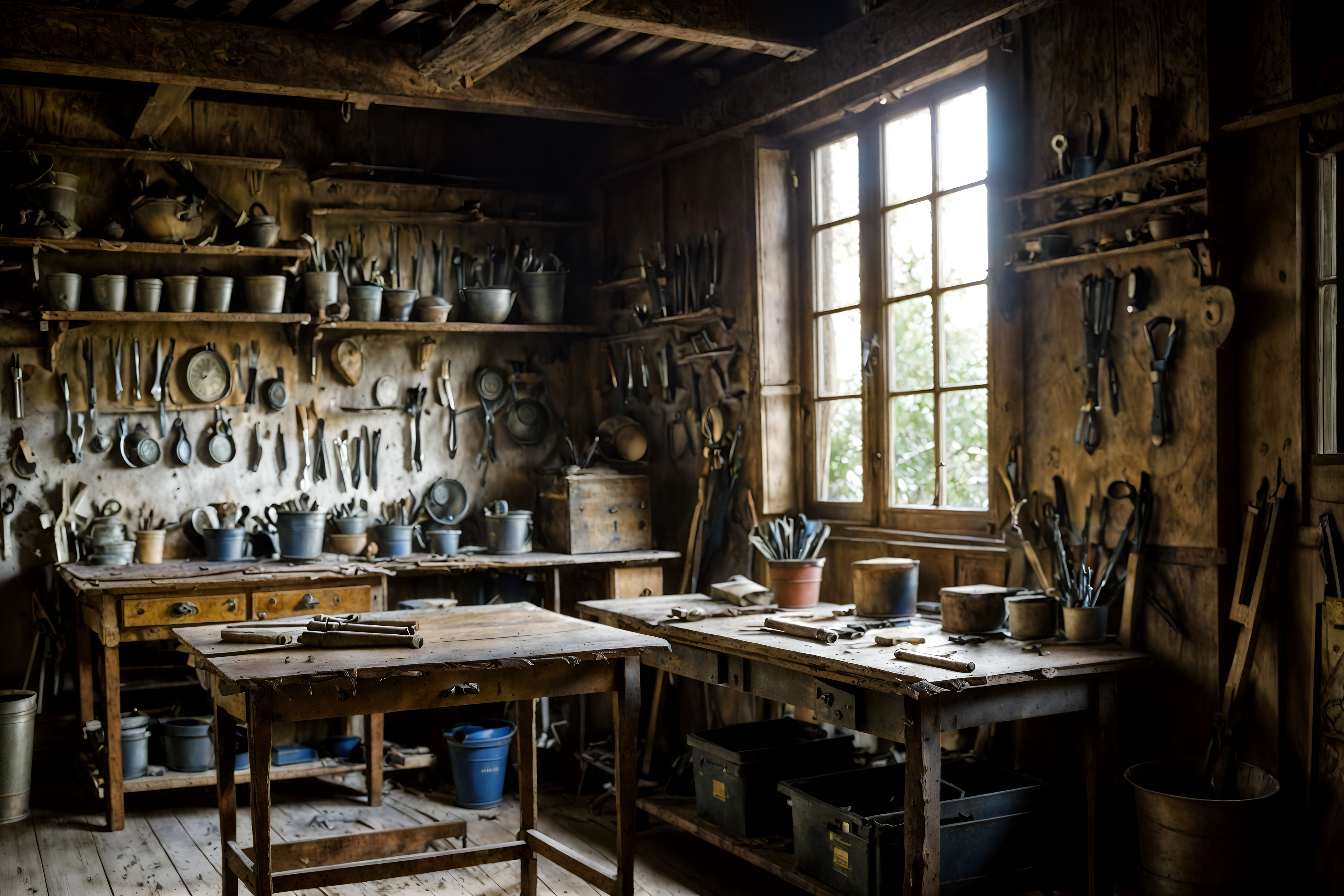 photo from pinterest of french-style interior designed (workshop interior) with messy and wooden workbench and tool wall and messy cinematic photo, highly detailed, cinematic lighting, ultra-detailed, ultrarealistic, photorealism, 8k. trending on pinterest. french interior design style. masterpiece, cinematic light, ultrarealistic+, photorealistic+, 8k, raw photo, realistic, sharp focus on eyes, (symmetrical eyes), (intact eyes), hyperrealistic, highest quality, best quality, , highly detailed, masterpiece, best quality, extremely detailed 8k wallpaper, masterpiece, best quality, ultra-detailed, best shadow, detailed background, detailed face, detailed eyes, high contrast, best illumination, detailed face, dulux, caustic, dynamic angle, detailed glow. dramatic lighting. highly detailed, insanely detailed hair, symmetrical, intricate details, professionally retouched, 8k high definition. strong bokeh. award winning photo.