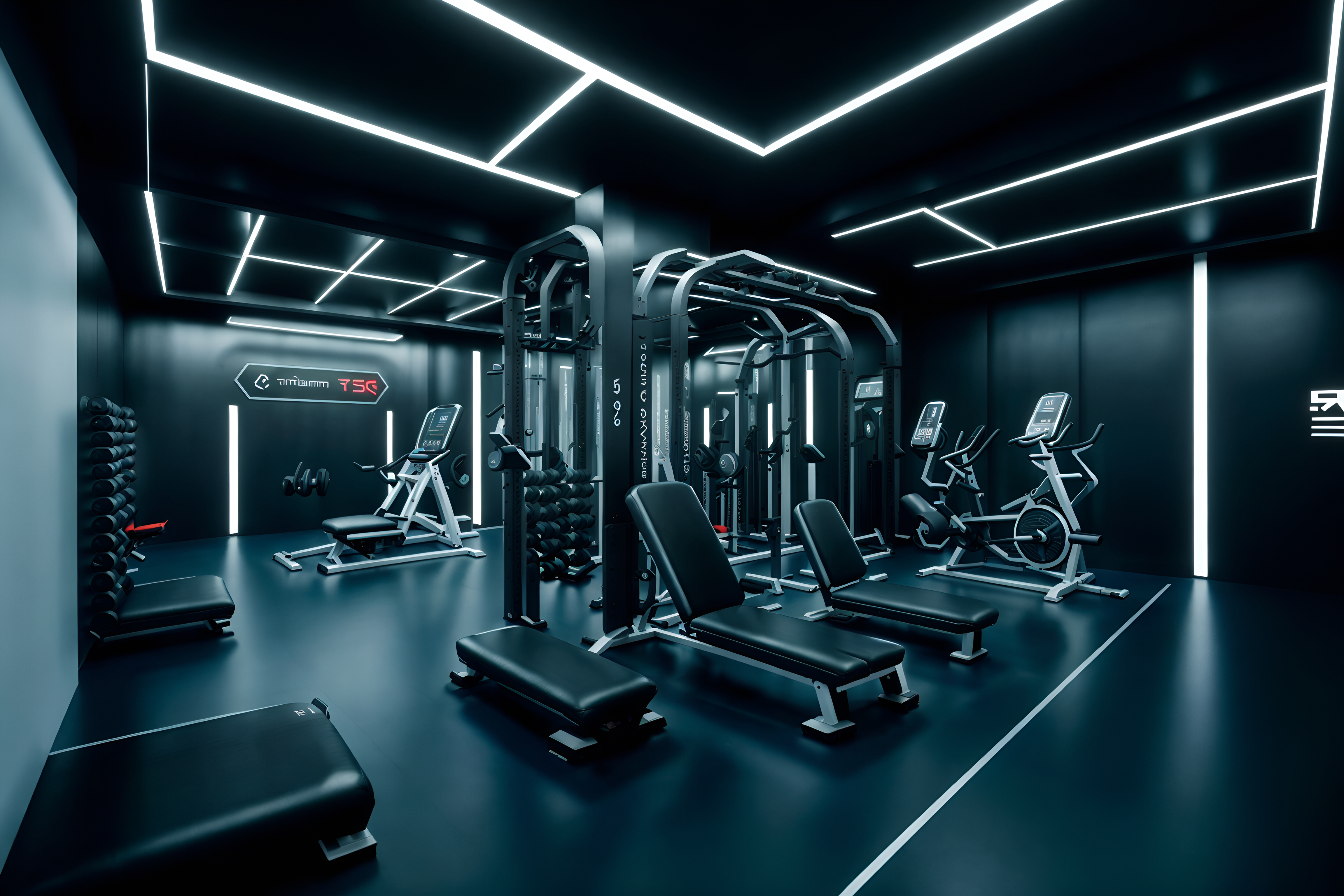 photo from pinterest of futuristic-style interior designed (fitness gym interior) with dumbbell stand and exercise bicycle and crosstrainer and bench press and squat rack and dumbbell stand. . with futurism minimalist interior and spaceship interior and monochromatic palette and floating surfaces and steel finishing and futuristic interior and minimalist clean lines and strong geometric walls. . cinematic photo, highly detailed, cinematic lighting, ultra-detailed, ultrarealistic, photorealism, 8k. trending on pinterest. futuristic interior design style. masterpiece, cinematic light, ultrarealistic+, photorealistic+, 8k, raw photo, realistic, sharp focus on eyes, (symmetrical eyes), (intact eyes), hyperrealistic, highest quality, best quality, , highly detailed, masterpiece, best quality, extremely detailed 8k wallpaper, masterpiece, best quality, ultra-detailed, best shadow, detailed background, detailed face, detailed eyes, high contrast, best illumination, detailed face, dulux, caustic, dynamic angle, detailed glow. dramatic lighting. highly detailed, insanely detailed hair, symmetrical, intricate details, professionally retouched, 8k high definition. strong bokeh. award winning photo.