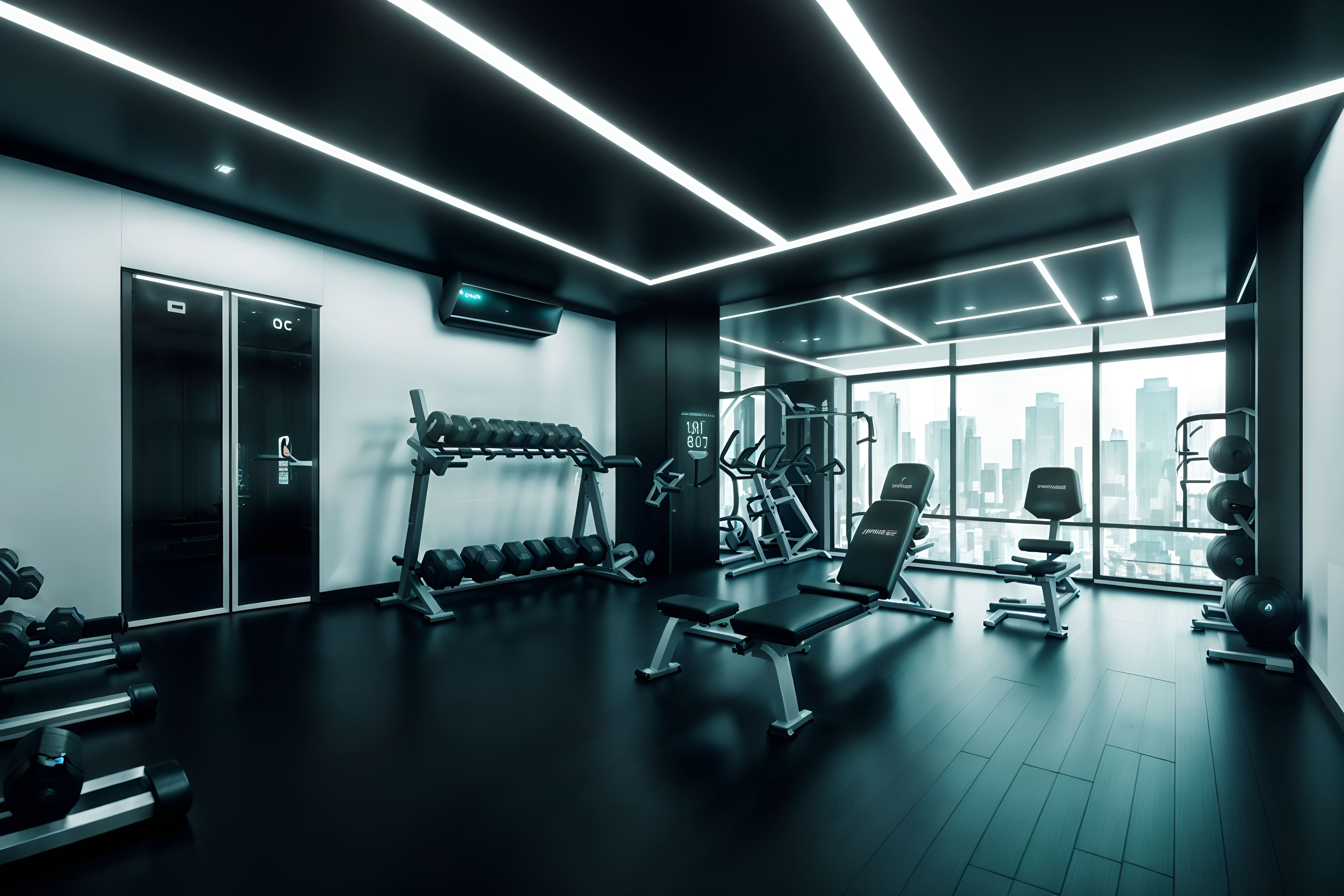 photo from pinterest of futuristic-style interior designed (fitness gym interior) with dumbbell stand and exercise bicycle and crosstrainer and bench press and squat rack and dumbbell stand. . with futurism minimalist interior and spaceship interior and monochromatic palette and floating surfaces and steel finishing and futuristic interior and minimalist clean lines and strong geometric walls. . cinematic photo, highly detailed, cinematic lighting, ultra-detailed, ultrarealistic, photorealism, 8k. trending on pinterest. futuristic interior design style. masterpiece, cinematic light, ultrarealistic+, photorealistic+, 8k, raw photo, realistic, sharp focus on eyes, (symmetrical eyes), (intact eyes), hyperrealistic, highest quality, best quality, , highly detailed, masterpiece, best quality, extremely detailed 8k wallpaper, masterpiece, best quality, ultra-detailed, best shadow, detailed background, detailed face, detailed eyes, high contrast, best illumination, detailed face, dulux, caustic, dynamic angle, detailed glow. dramatic lighting. highly detailed, insanely detailed hair, symmetrical, intricate details, professionally retouched, 8k high definition. strong bokeh. award winning photo.
