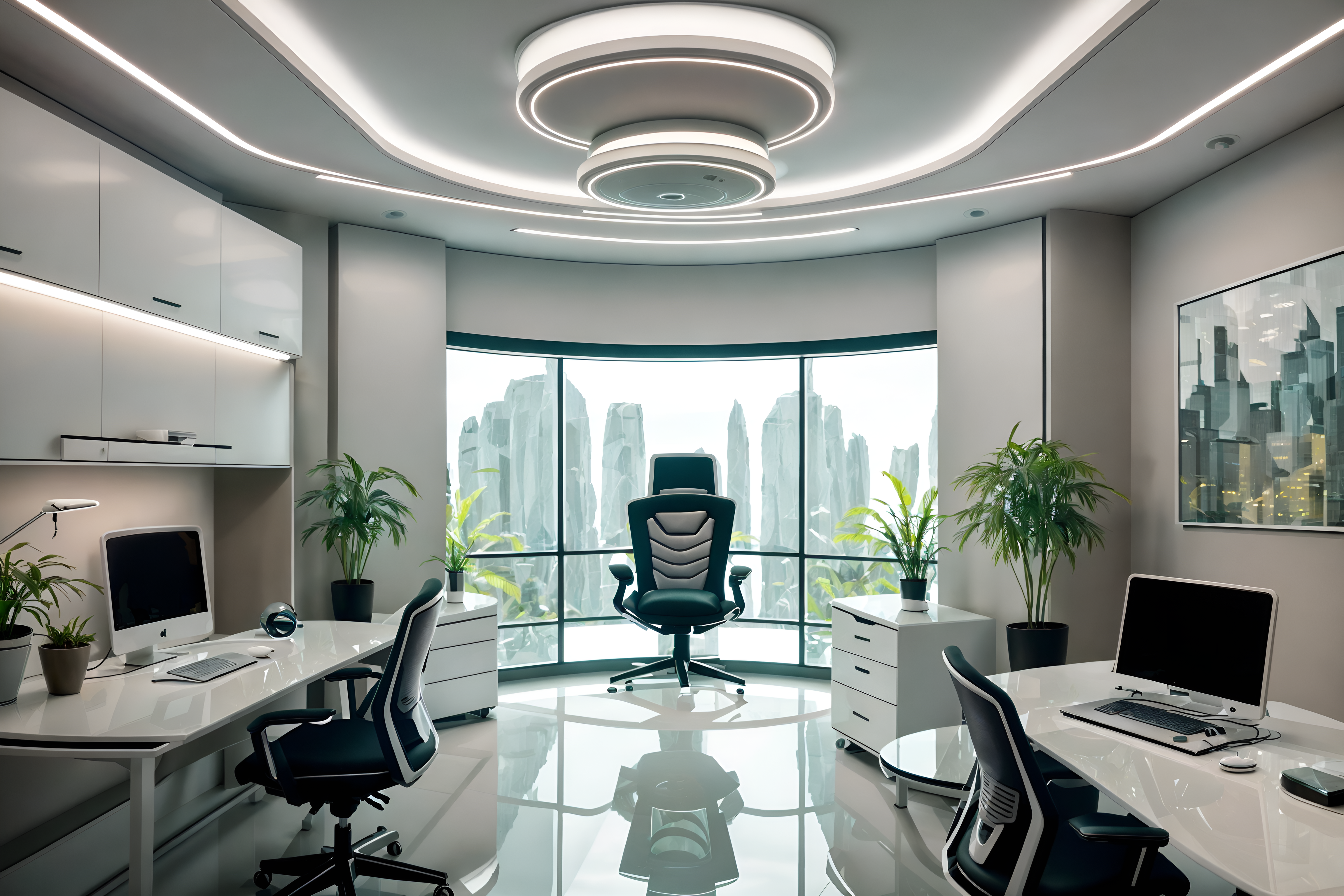 photo from pinterest of futuristic-style interior designed (home office interior) with desk lamp and plant and cabinets and computer desk and office chair and desk lamp. . with futurism minimalist interior and circular shapes and futuristic interior and smooth marble and light colors and monochromatic palette and neutral background and bright accents and glass panes. . cinematic photo, highly detailed, cinematic lighting, ultra-detailed, ultrarealistic, photorealism, 8k. trending on pinterest. futuristic interior design style. masterpiece, cinematic light, ultrarealistic+, photorealistic+, 8k, raw photo, realistic, sharp focus on eyes, (symmetrical eyes), (intact eyes), hyperrealistic, highest quality, best quality, , highly detailed, masterpiece, best quality, extremely detailed 8k wallpaper, masterpiece, best quality, ultra-detailed, best shadow, detailed background, detailed face, detailed eyes, high contrast, best illumination, detailed face, dulux, caustic, dynamic angle, detailed glow. dramatic lighting. highly detailed, insanely detailed hair, symmetrical, intricate details, professionally retouched, 8k high definition. strong bokeh. award winning photo.