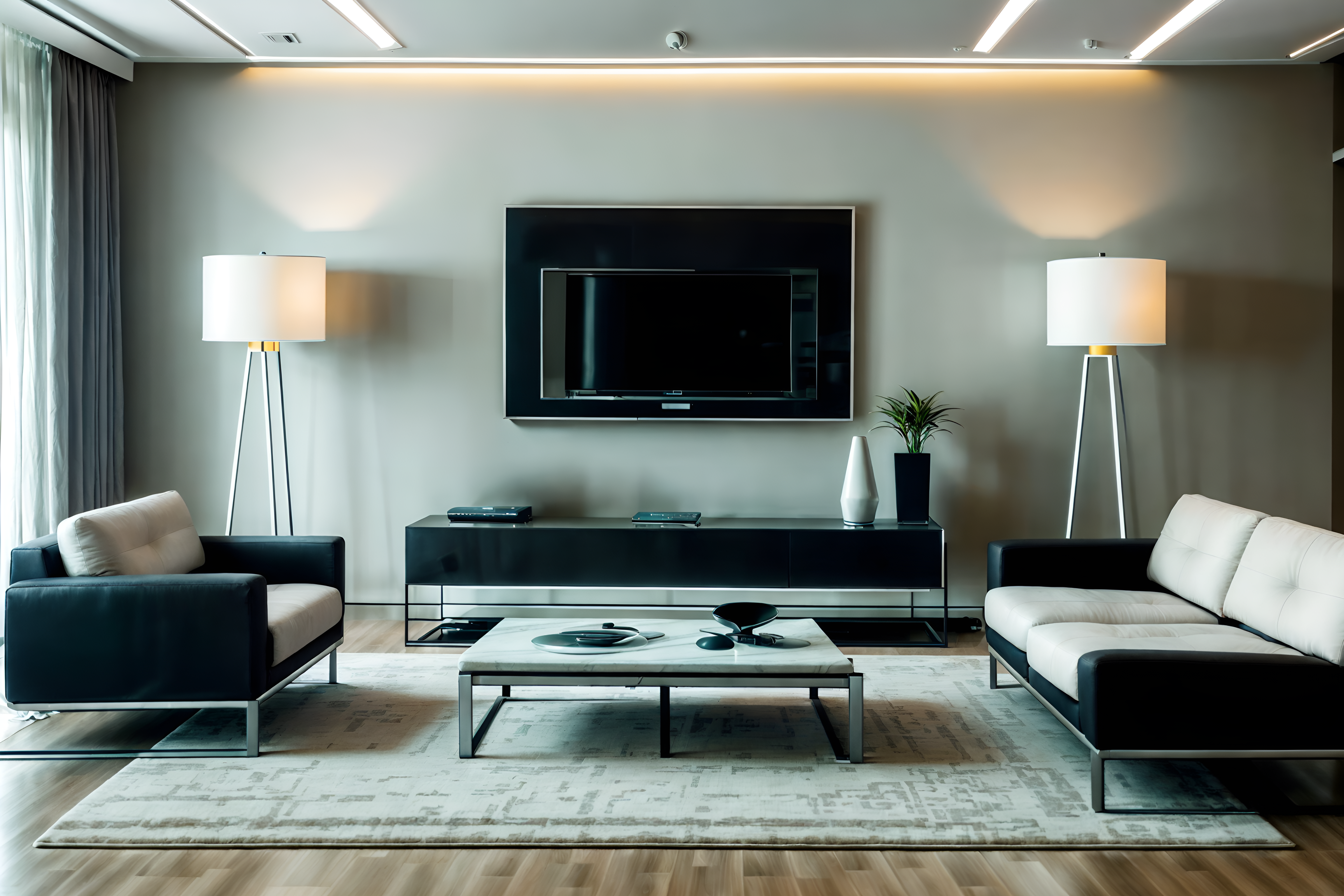 photo from pinterest of futuristic-style interior designed (living room interior) with sofa and furniture and occasional tables and televisions and rug and chairs and plant and electric lamps. . with minimalist clean lines and strong geometric walls and futurism and futuristic interior and futurism minimalist interior and steel finishing and neutral background and bright accents and smooth marble. . cinematic photo, highly detailed, cinematic lighting, ultra-detailed, ultrarealistic, photorealism, 8k. trending on pinterest. futuristic interior design style. masterpiece, cinematic light, ultrarealistic+, photorealistic+, 8k, raw photo, realistic, sharp focus on eyes, (symmetrical eyes), (intact eyes), hyperrealistic, highest quality, best quality, , highly detailed, masterpiece, best quality, extremely detailed 8k wallpaper, masterpiece, best quality, ultra-detailed, best shadow, detailed background, detailed face, detailed eyes, high contrast, best illumination, detailed face, dulux, caustic, dynamic angle, detailed glow. dramatic lighting. highly detailed, insanely detailed hair, symmetrical, intricate details, professionally retouched, 8k high definition. strong bokeh. award winning photo.