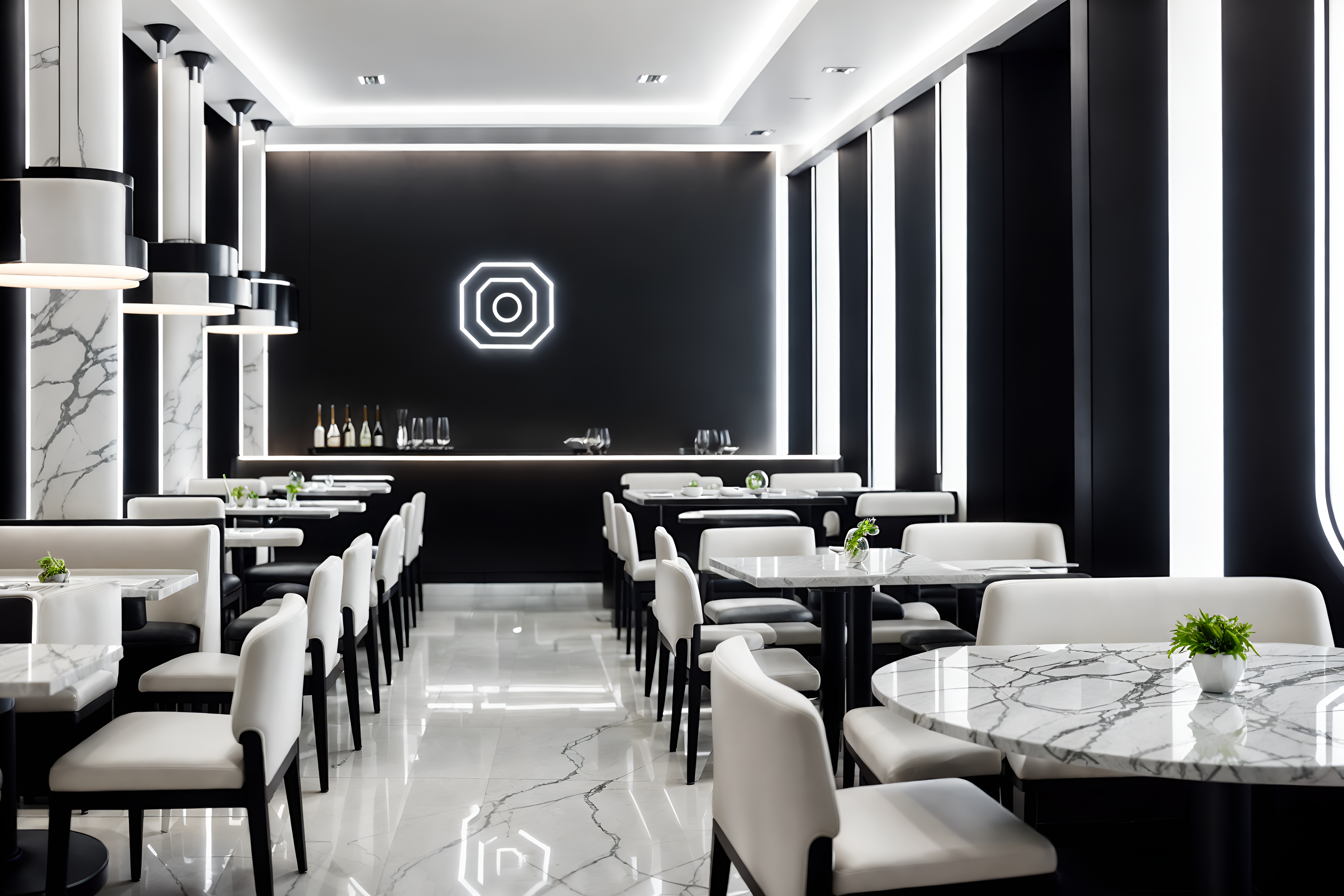 photo from pinterest of futuristic-style interior designed (restaurant interior) with restaurant decor and restaurant dining tables and restaurant chairs and restaurant bar and restaurant decor. . with minimalist clean lines and strong geometric walls and futuristic interior and smooth polished marble and floating surfaces and monochromatic palette and smooth marble and neutral background and bright accents. . cinematic photo, highly detailed, cinematic lighting, ultra-detailed, ultrarealistic, photorealism, 8k. trending on pinterest. futuristic interior design style. masterpiece, cinematic light, ultrarealistic+, photorealistic+, 8k, raw photo, realistic, sharp focus on eyes, (symmetrical eyes), (intact eyes), hyperrealistic, highest quality, best quality, , highly detailed, masterpiece, best quality, extremely detailed 8k wallpaper, masterpiece, best quality, ultra-detailed, best shadow, detailed background, detailed face, detailed eyes, high contrast, best illumination, detailed face, dulux, caustic, dynamic angle, detailed glow. dramatic lighting. highly detailed, insanely detailed hair, symmetrical, intricate details, professionally retouched, 8k high definition. strong bokeh. award winning photo.