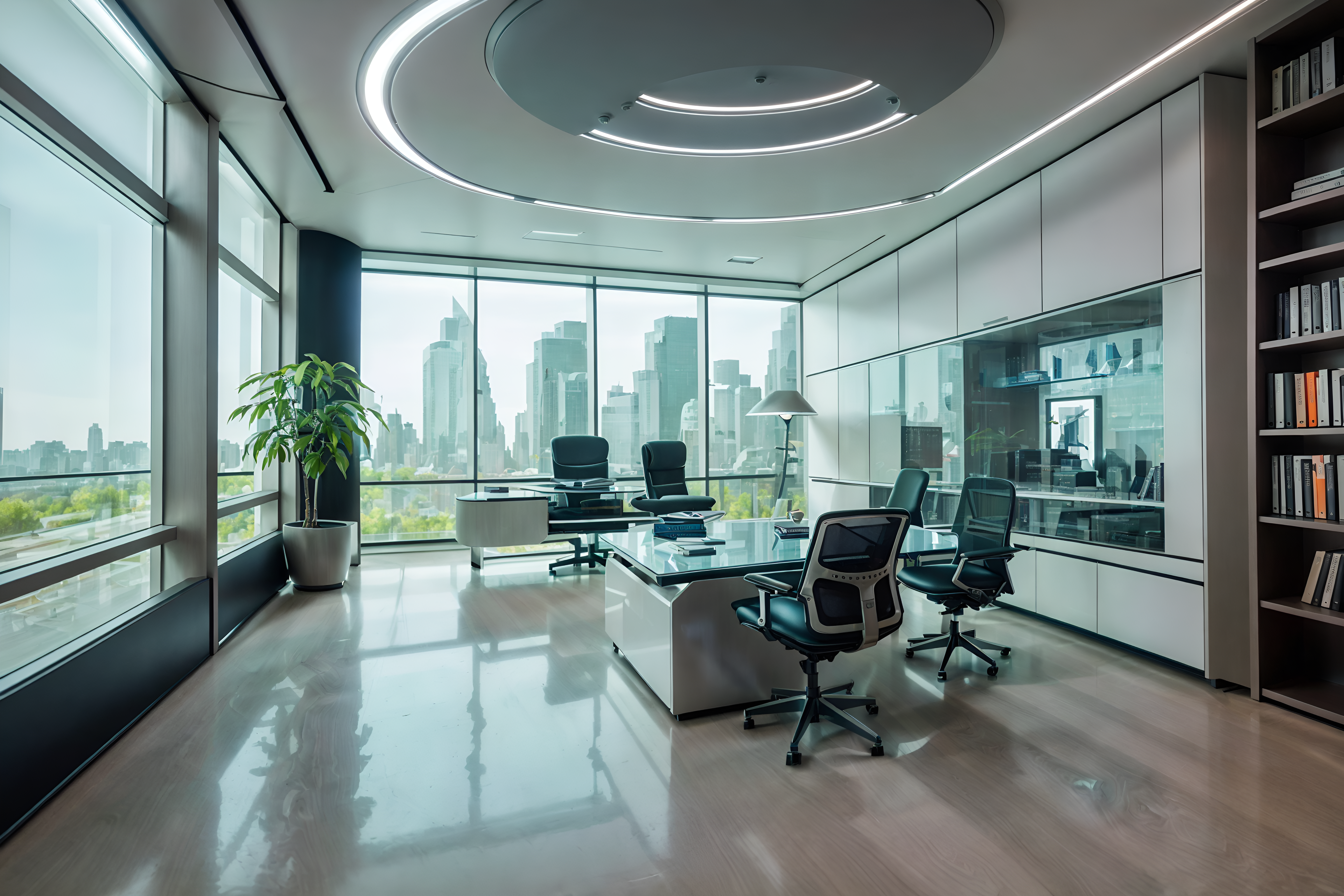 futuristic study roomsinterior decorate this study room with futuristic style. . . with office chair and plant and desk lamp and lounge chair and cabinets and bookshelves and writing desk and office chair. . with smooth polished marble and smooth marble and futurism minimalist interior and spaceship interior and glass panes and futurism and neutral background and bright accents and circular shapes. . .