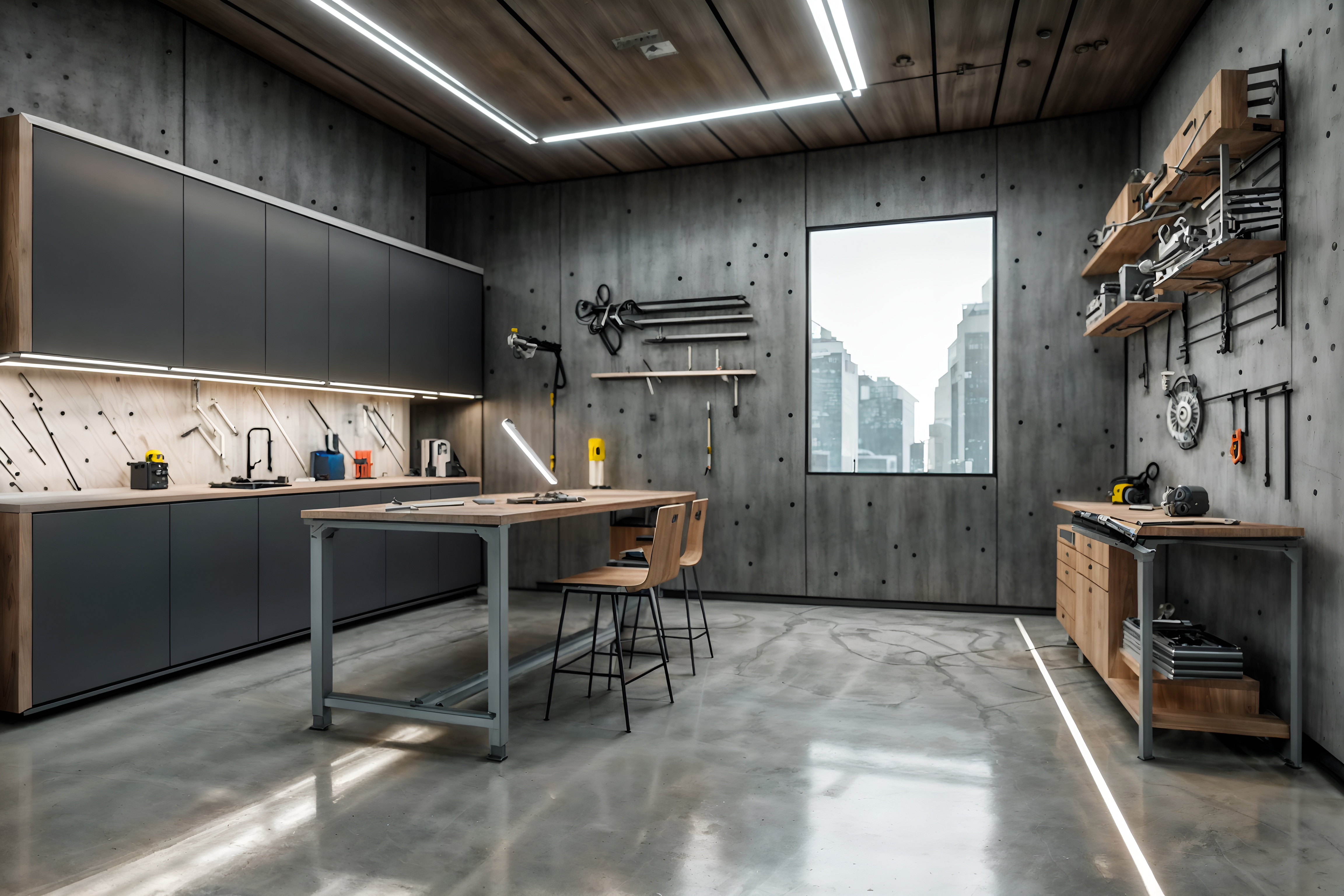 photo from pinterest of futuristic-style interior designed (workshop interior) with tool wall and wooden workbench and messy and tool wall. . with minimalist clean lines and light colors and smooth marble and floating surfaces and steel finishing and futuristic interior and strong geometric walls and neutral background and bright accents. . cinematic photo, highly detailed, cinematic lighting, ultra-detailed, ultrarealistic, photorealism, 8k. trending on pinterest. futuristic interior design style. masterpiece, cinematic light, ultrarealistic+, photorealistic+, 8k, raw photo, realistic, sharp focus on eyes, (symmetrical eyes), (intact eyes), hyperrealistic, highest quality, best quality, , highly detailed, masterpiece, best quality, extremely detailed 8k wallpaper, masterpiece, best quality, ultra-detailed, best shadow, detailed background, detailed face, detailed eyes, high contrast, best illumination, detailed face, dulux, caustic, dynamic angle, detailed glow. dramatic lighting. highly detailed, insanely detailed hair, symmetrical, intricate details, professionally retouched, 8k high definition. strong bokeh. award winning photo.