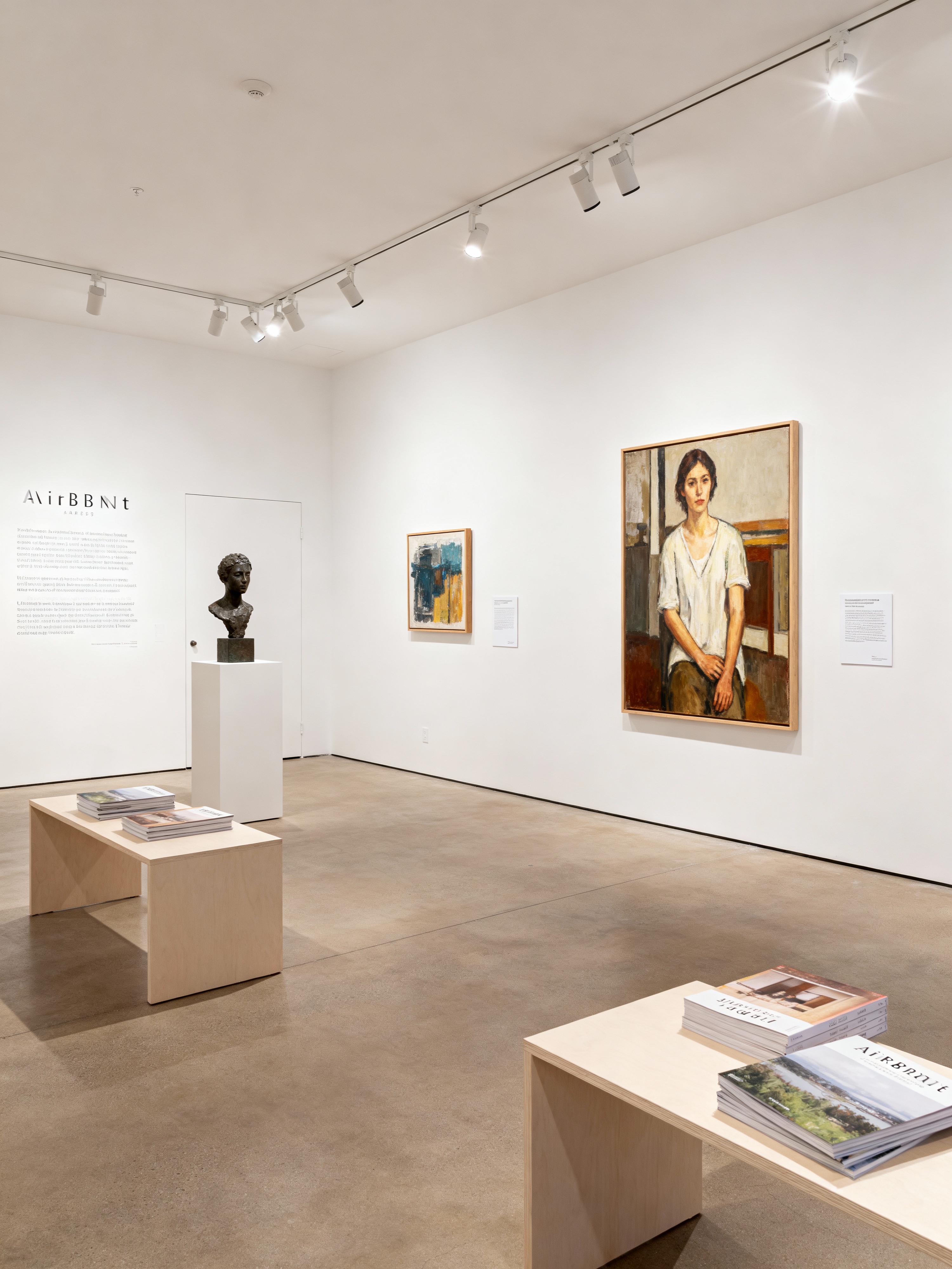 gallery with airbnb style with track lighting and spotlights and information plaques and paintings and artwork and white walls and exhibition catalogs and sculptures. . with scandinavian style and practicality and functionality and simple color palette and simple, clean lines and simplistic furniture and open and natural lighting and natural materials and elements and neutral walls and textures and scandinavian style