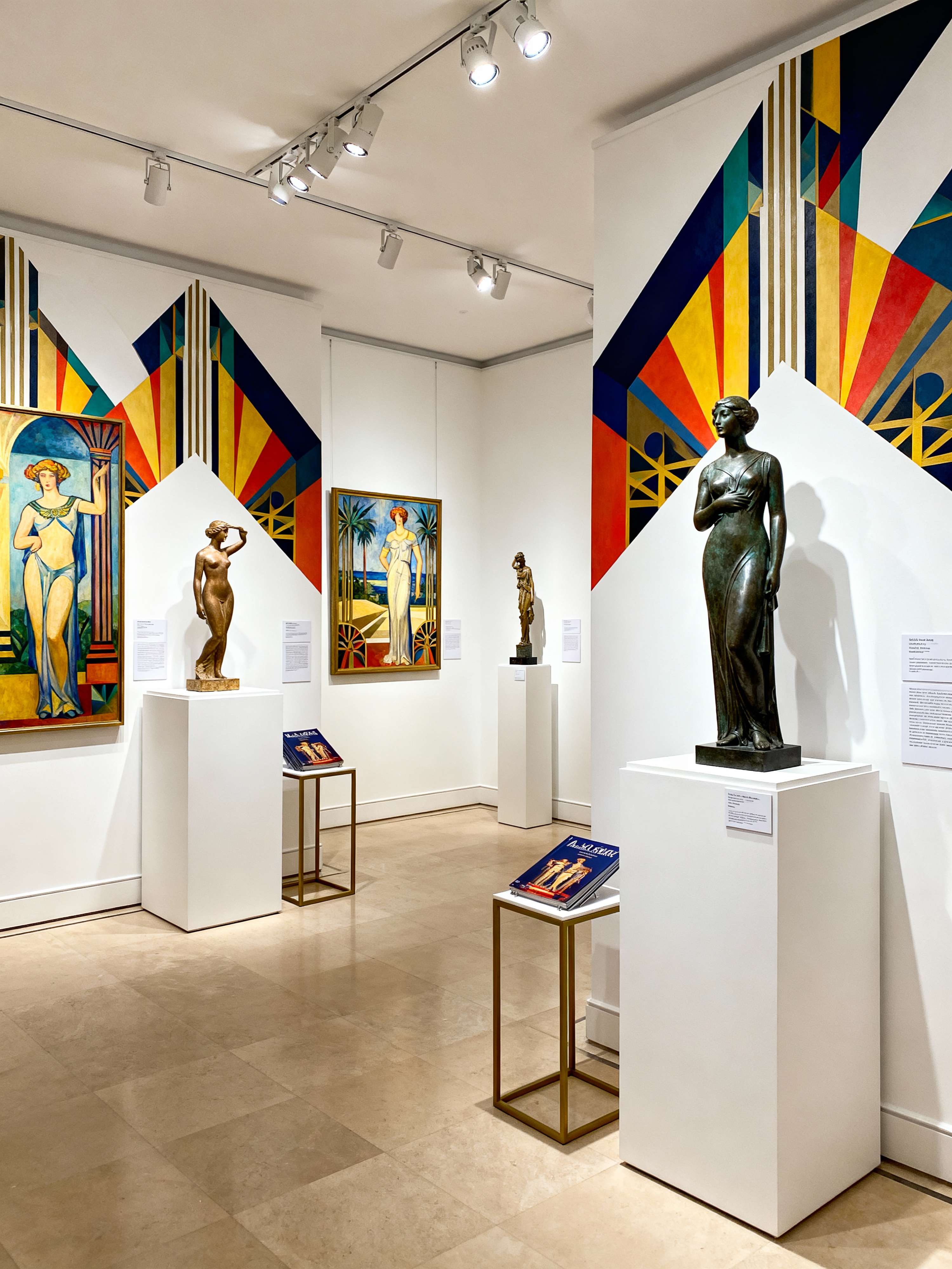 gallery with art deco style with pedestals and sculptures and spotlights and paintings and track lighting and information plaques and white walls and exhibition catalogs. . with bold geometry and angular shapes and rich colors and exuberant shapes and bright and cheerful colors and smooth lines and geometric lines and decadent detail
