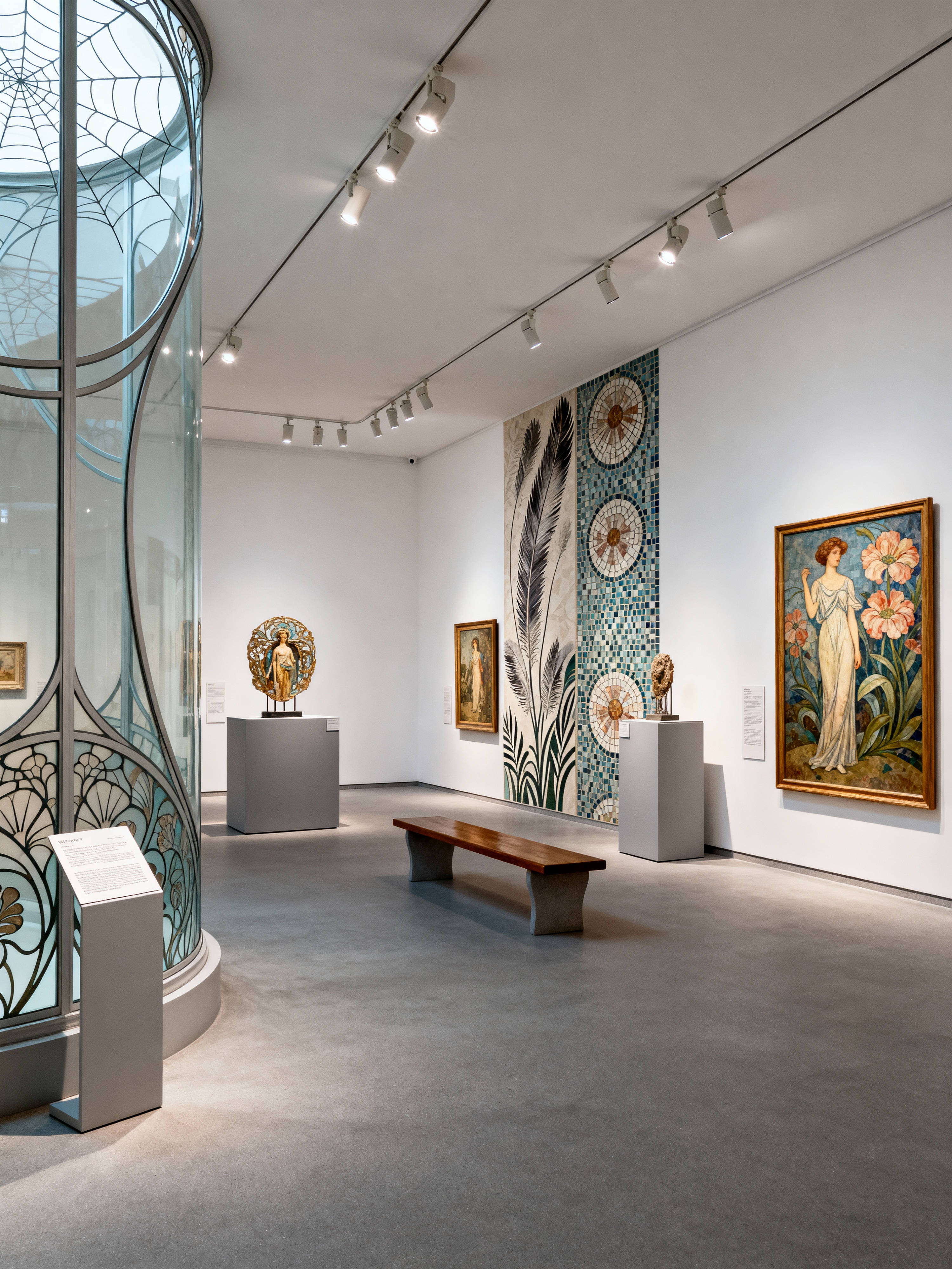 gallery with art nouveau style with pedestals and information plaques and track lighting and paintings and spotlights and white walls and artwork and benches. . with ashy colors and wallpaper pattners of spider webs and natural materials and soft, rounded lines and curved glass and wallpaper patterns of feathers and mosaics and wallpaper patterns of stylized flowers