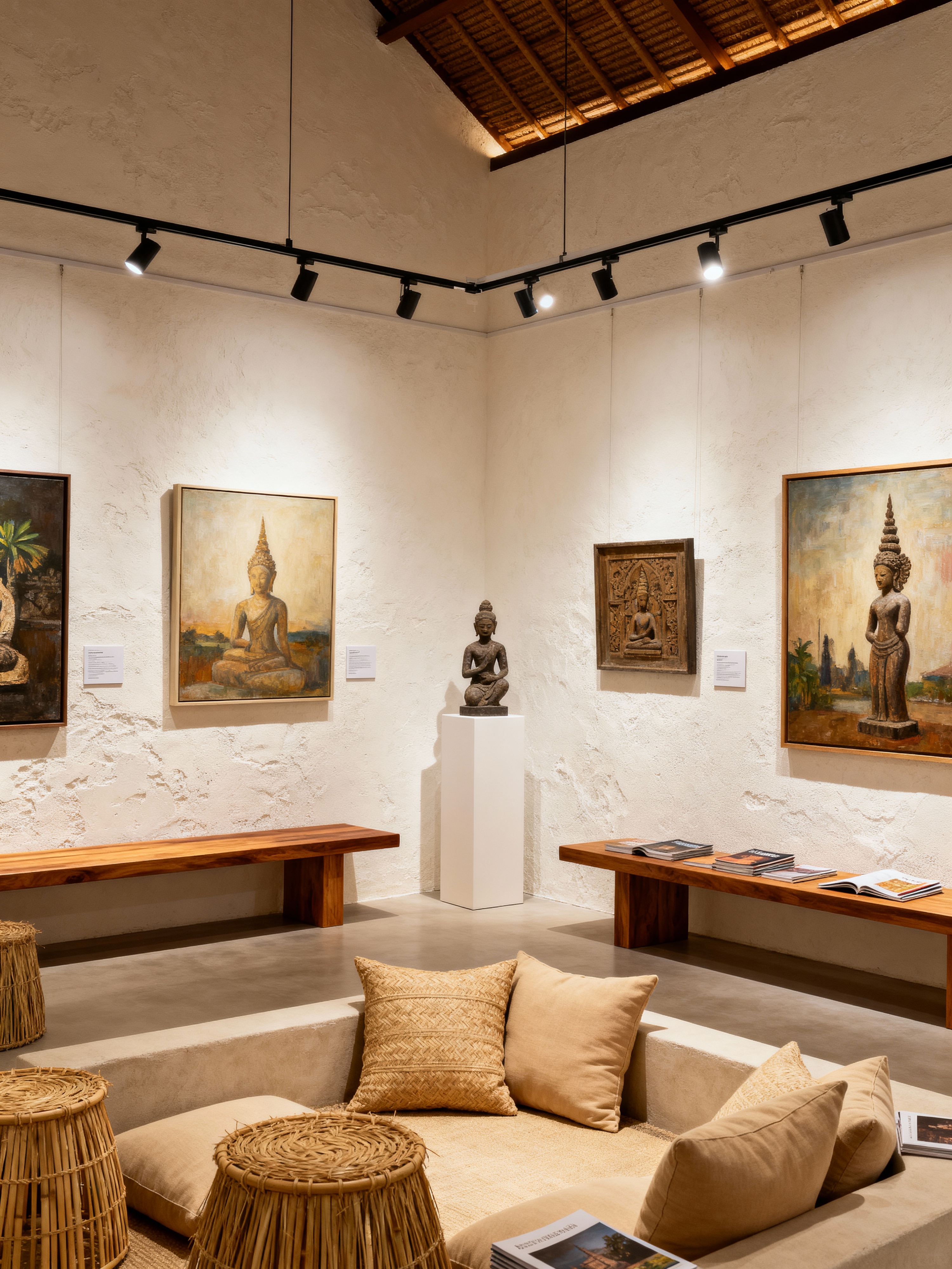 gallery with bali style with white walls and benches and spotlights and information plaques and exhibition catalogs and track lighting and paintings and sculptures. . with warm ambient lighting and neutral color palette and beige and sand tone cushions and conversation pit with pillows and raffia or bamboo accents and white or cream walls and light wood furniture (teak, oak) and textured plaster or stucco finish