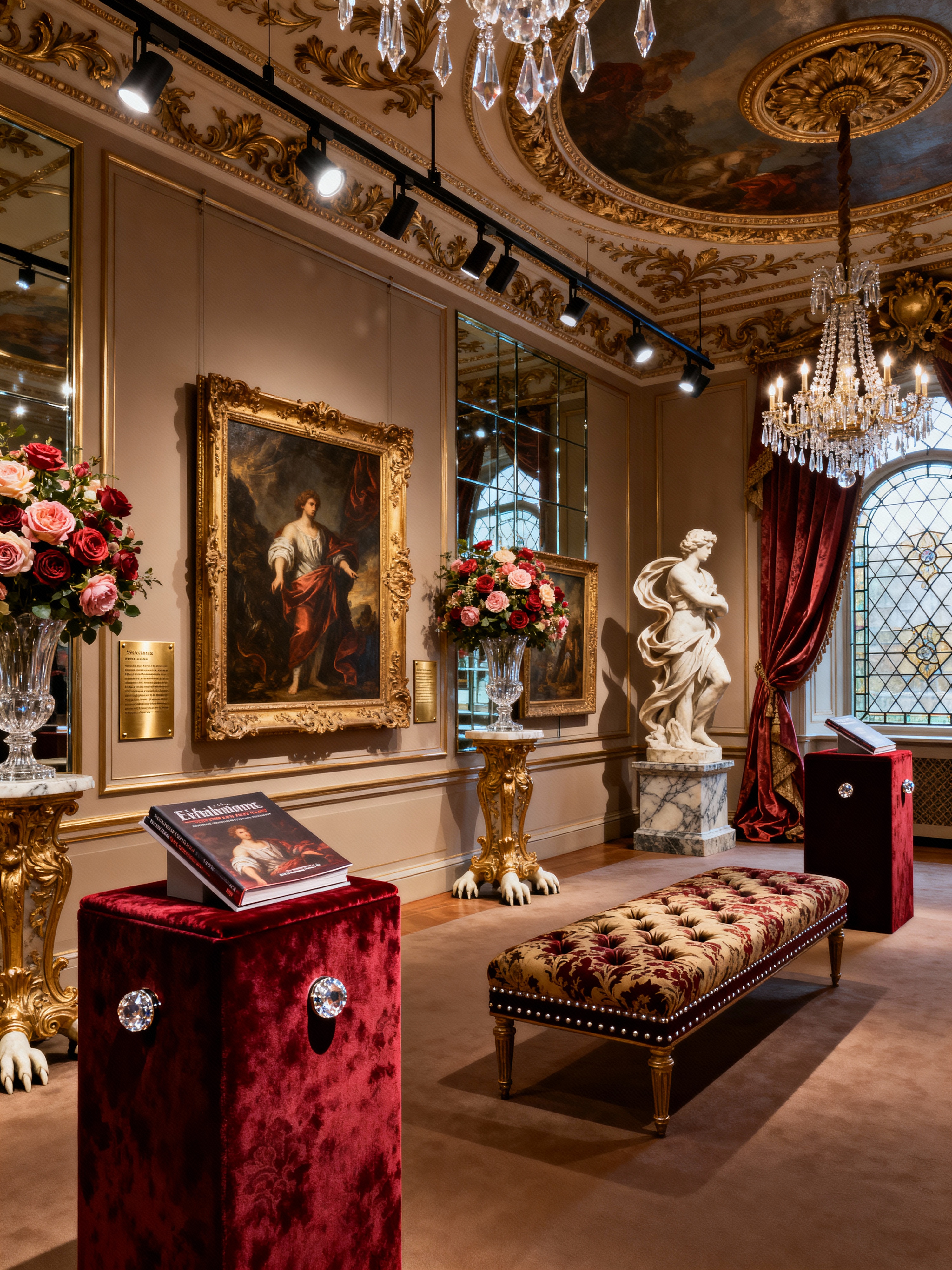 gallery with baroque style with exhibition catalogs and paintings and information plaques and artwork and spotlights and track lighting and benches and sculptures. . with luxurious floral and damask fabrics and movement and heavy moldings and pedestal feet and intricate carvings and ornaments and crystal and glass accents and sensuous richness and tension
