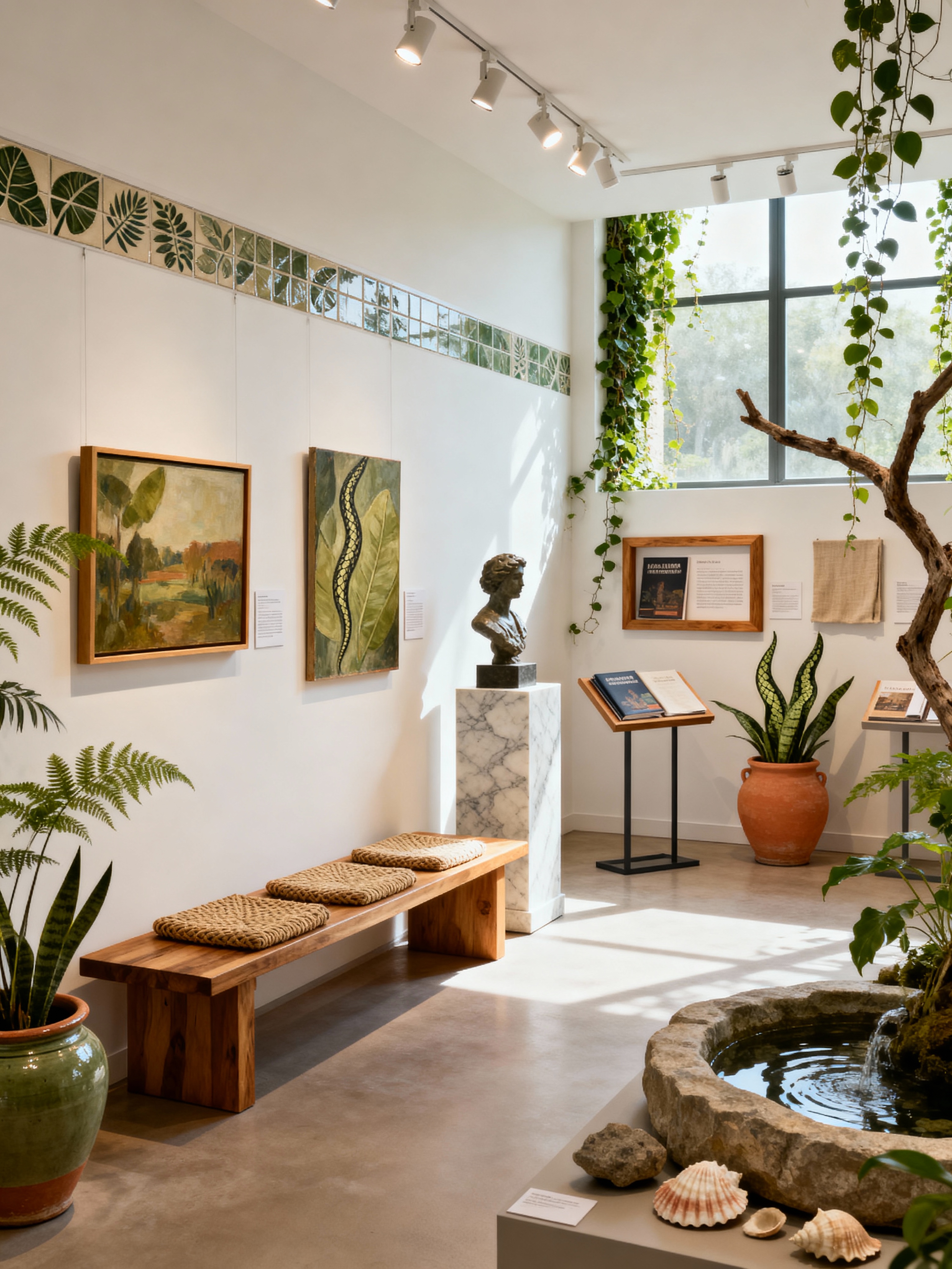 gallery with biophilic style with white walls and paintings and benches and spotlights and information plaques and pedestals and exhibition catalogs and sculptures. . with plants and natural patterns and ceramic materials and environmental features and features of the natural world and sunlight and features of nature and earthy colors