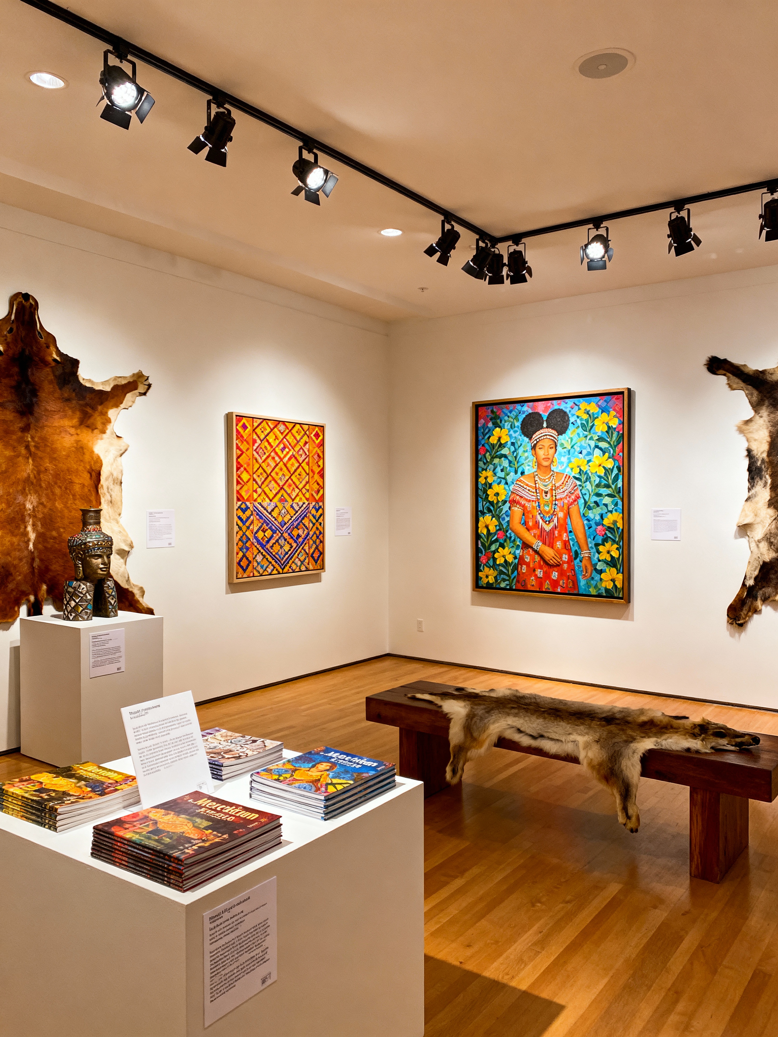 gallery with bohemian style with track lighting and exhibition catalogs and artwork and information plaques and spotlights and pedestals and benches and paintings. . with animal hides and playful colors and bold colors and carefree layers of pattern, texture, and color and playful patterns and metals and woods and playful textures