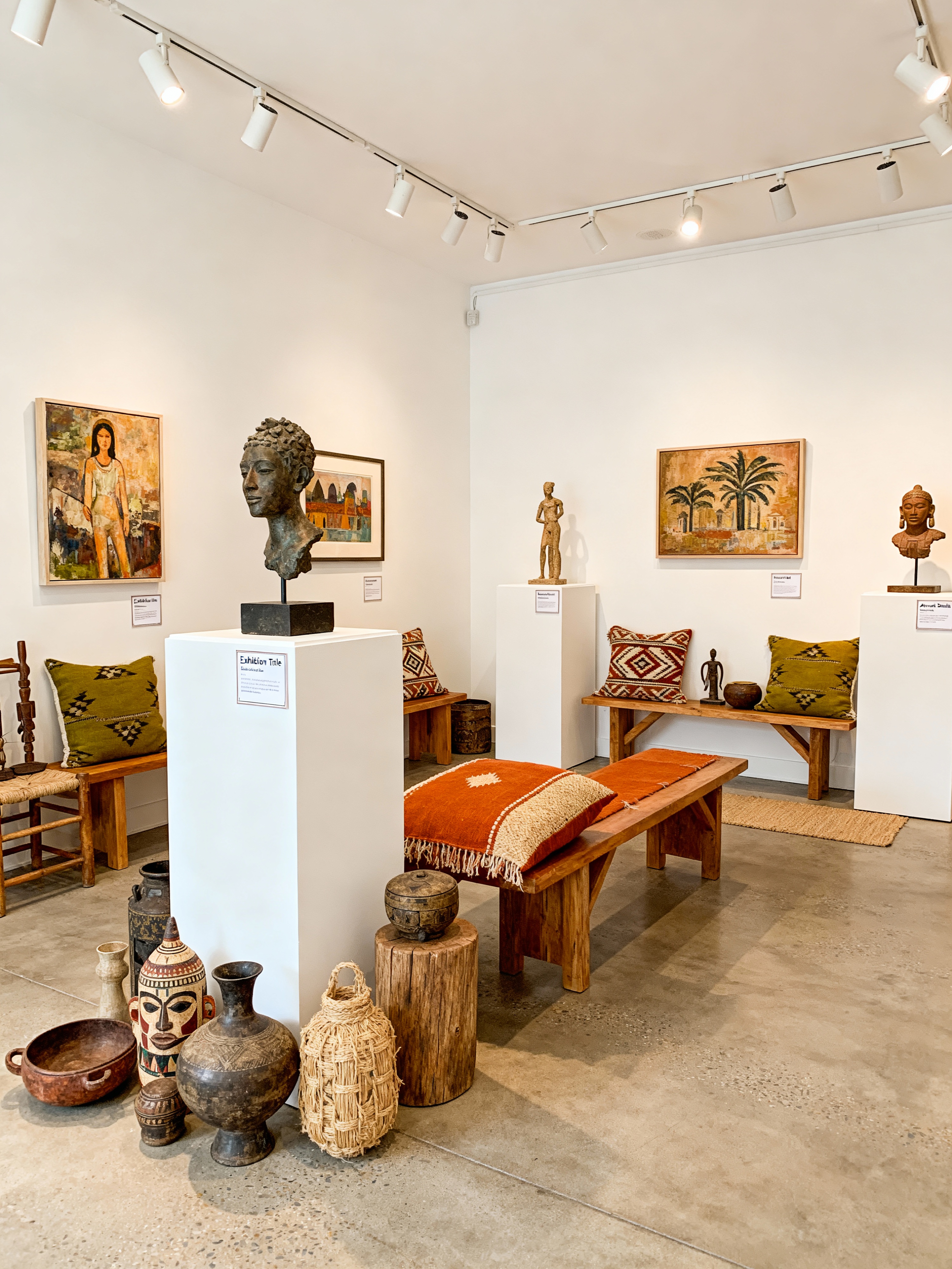 gallery with boho-chic style with spotlights and track lighting and pedestals and artwork and information plaques and sculptures and benches and white walls. . with vintage finds and bohemian flair and eclectic mix and global artifacts and free-spirited and relaxed atmosphere and natural materials and earthy colors