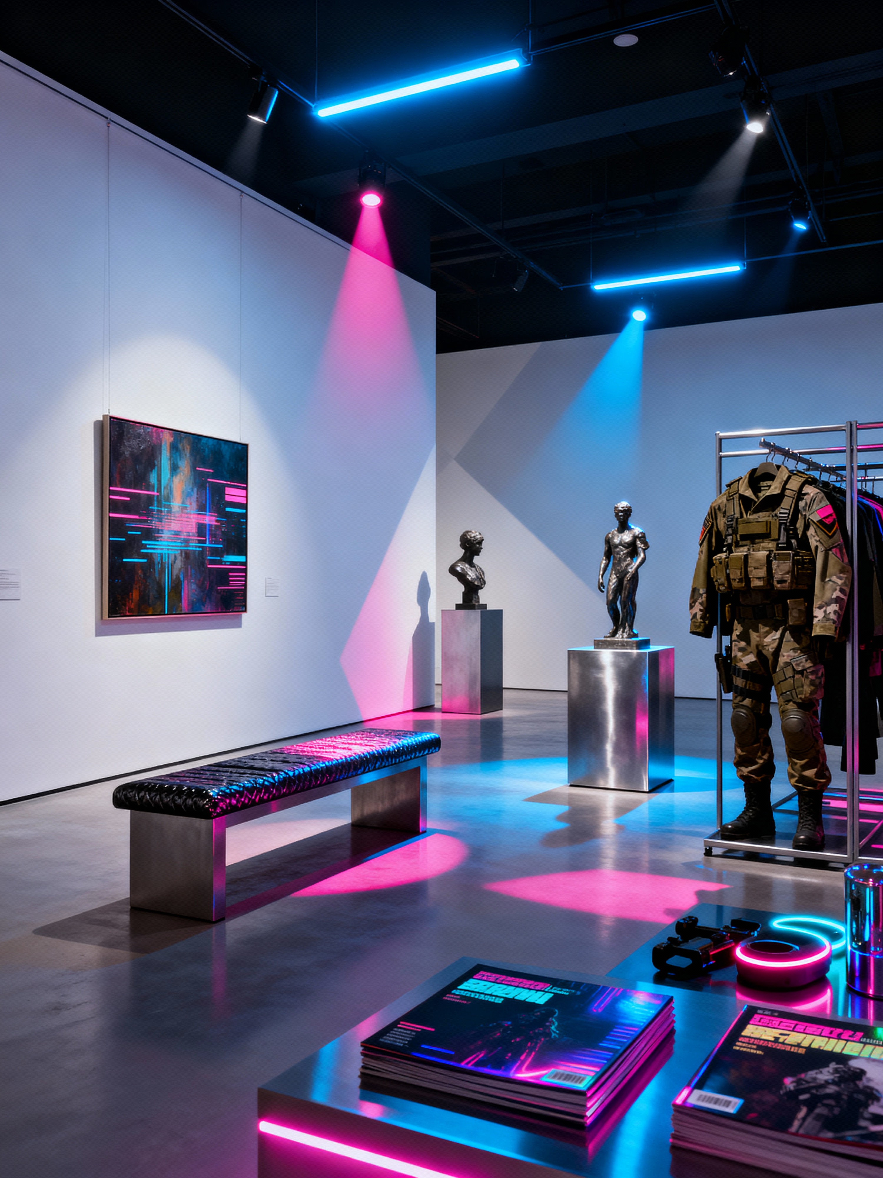 gallery with cyberpunk style with benches and paintings and sculptures and pedestals and white walls and artwork and exhibition catalogs and spotlights. . with led lights and cyberpunk style and military uniforms and gear and synthetic objects and color lights glow and strong geometric walls and bladerunner style and dark night