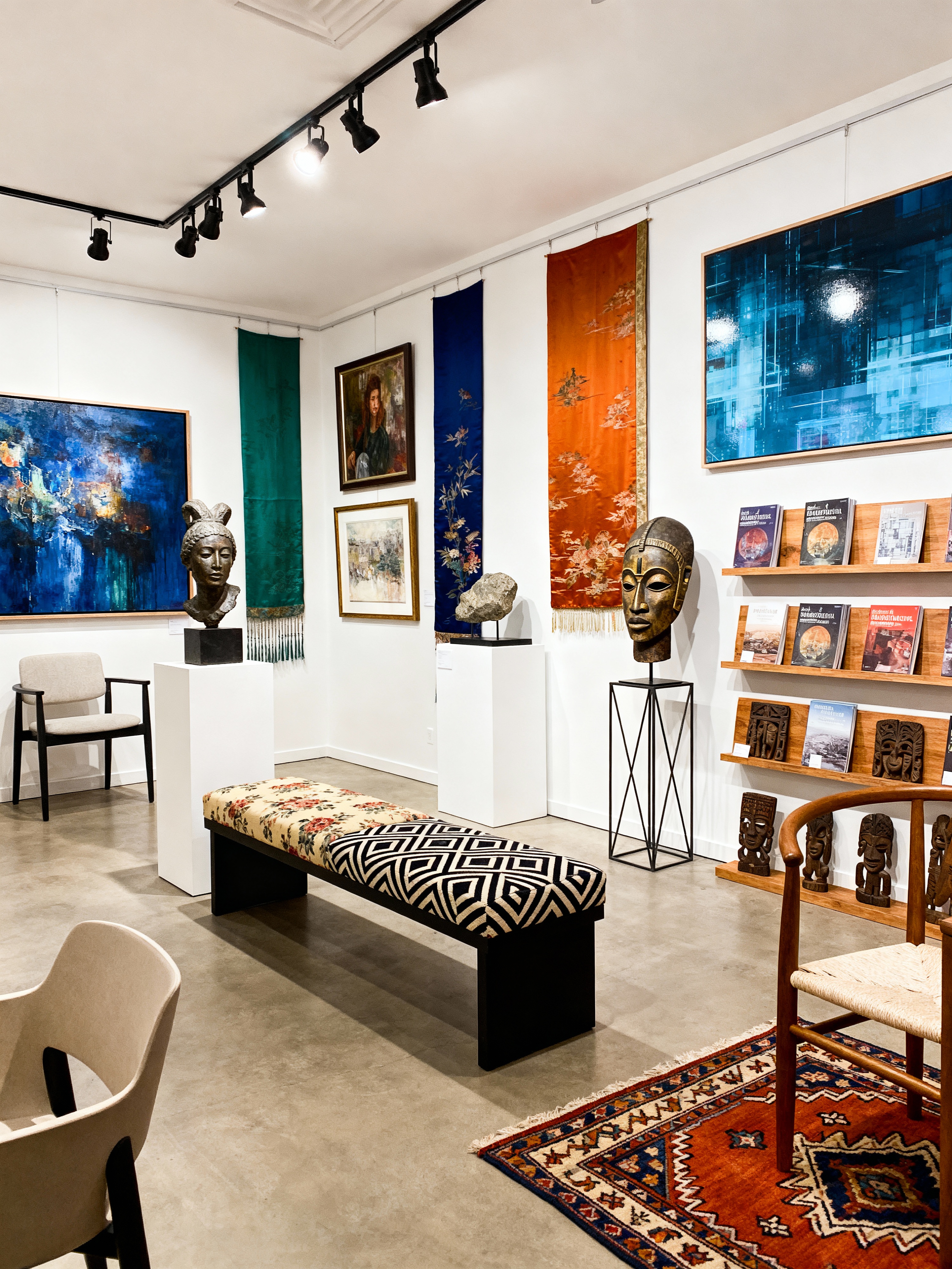 gallery with eclectic style with pedestals and benches and sculptures and spotlights and artwork and exhibition catalogs and white walls and track lighting. . with unexpected elements and personal expression and mixed styles and layered textures and bold combinations and creative freedom and unique pieces and global influences