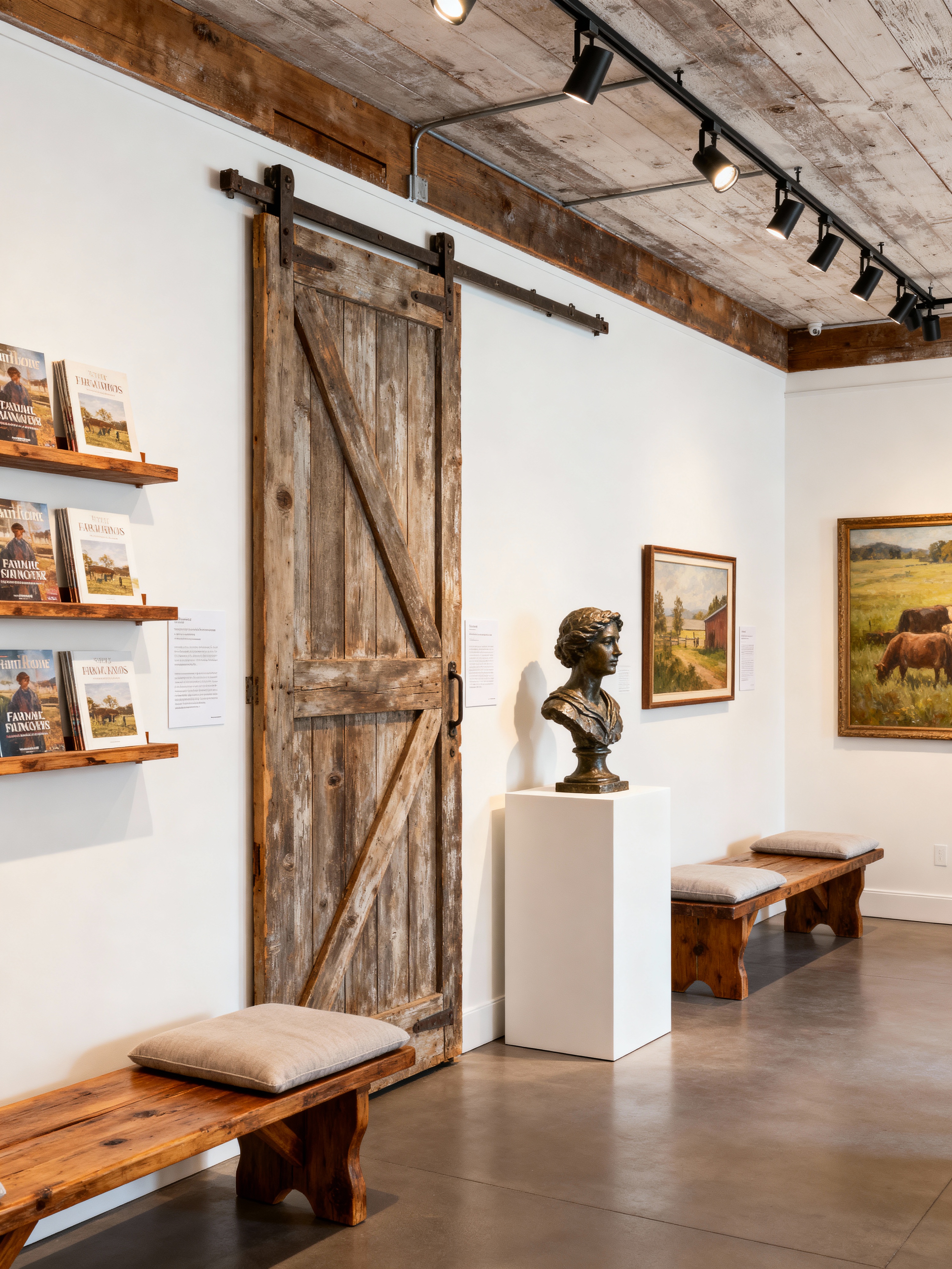gallery with farmhouse style with pedestals and sculptures and exhibition catalogs and artwork and benches and track lighting and information plaques and white walls. . with cozy feel and rustic charm and barn doors and industrial accents and vintage decor and country style and exposed wood and natural textures