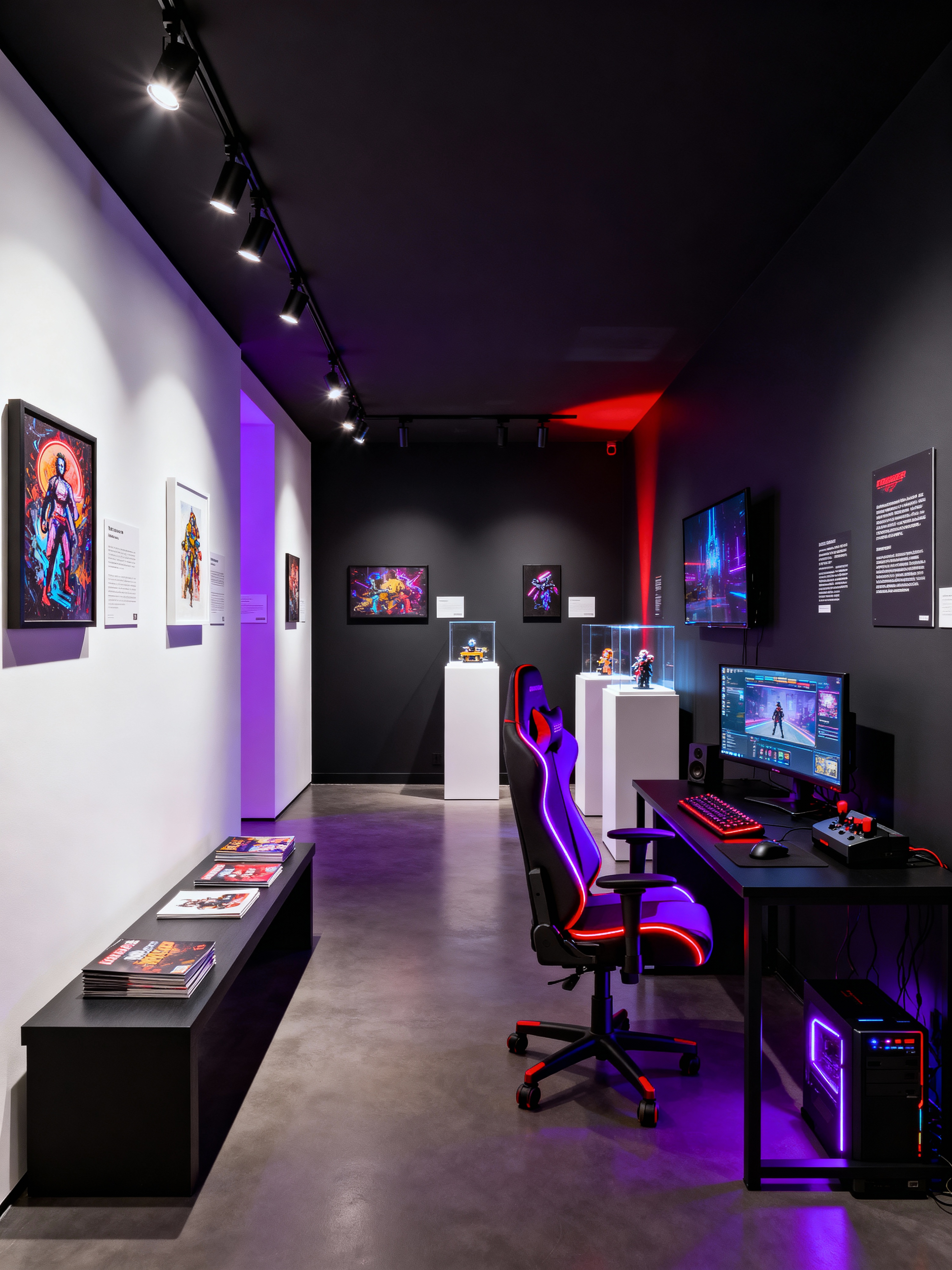 gallery with gaming room style with artwork and white walls and track lighting and spotlights and information plaques and exhibition catalogs and pedestals and benches. . with dark walls and dark lit room and multiple displays and dark room and computer desk with computer displays and keyboard and video game consoles and purple and red lights and gaming chair