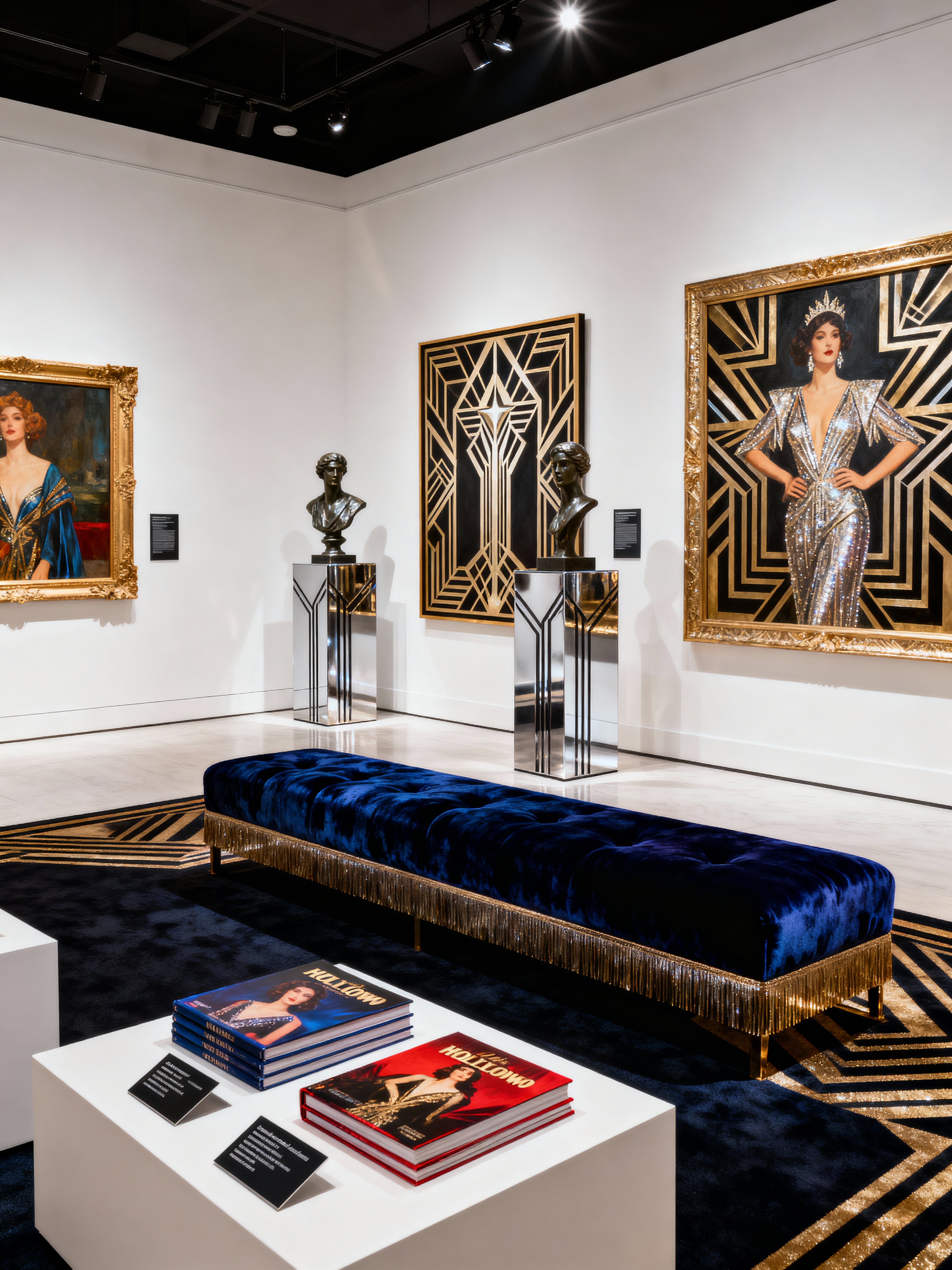 gallery with hollywood glam style with paintings and artwork and exhibition catalogs and white walls and benches and pedestals and information plaques and sculptures. . with opulent details and glamorous style and art deco influence and metallic accents and dramatic lighting and bold colors and luxurious fabrics and velvet upholstery