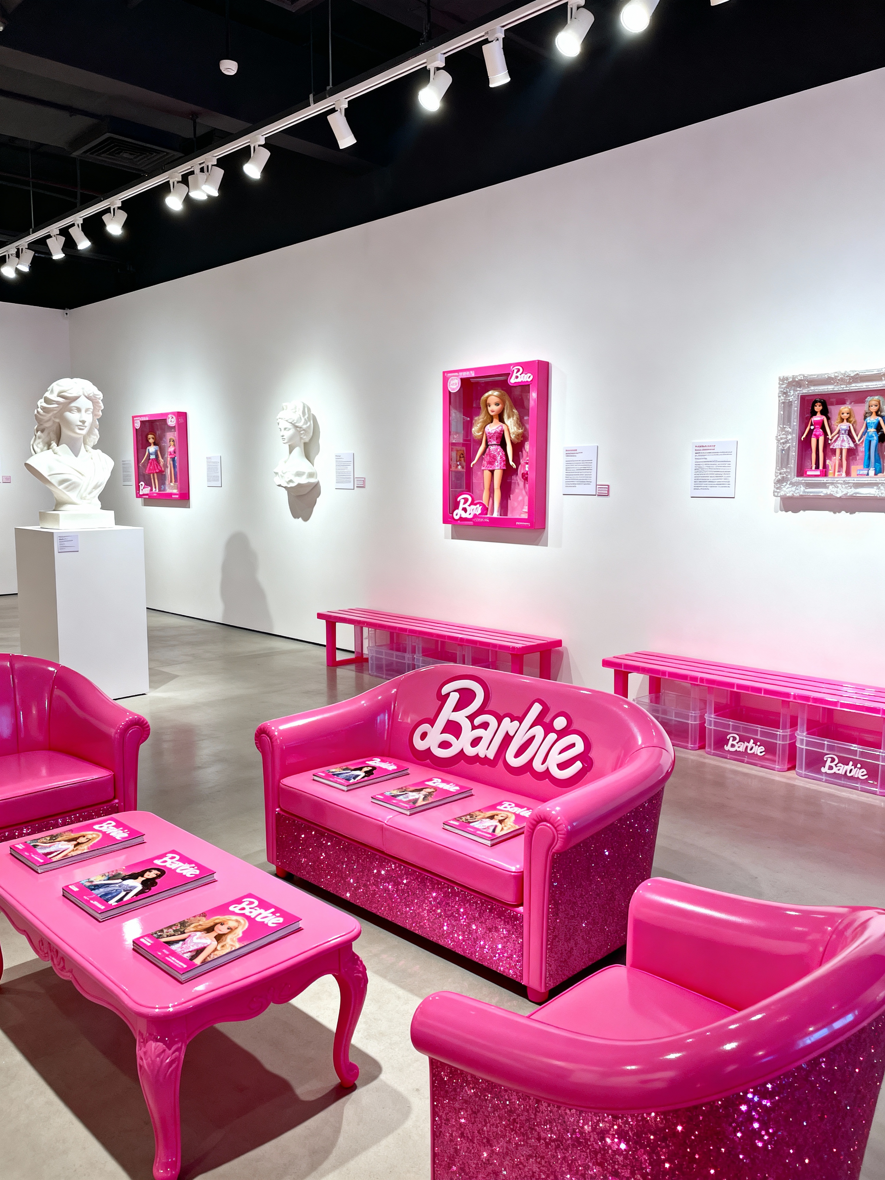 gallery with hot pink style with sculptures and white walls and track lighting and artwork and information plaques and exhibition catalogs and spotlights and benches. . with hot pink barbie colors and barbie sofa and barbie chairs and barbie glitter and sparkle and hot pink barbie walls and barbie plastic interior and barbie bold rosy hues like fuchsia and magenta and barbie style interior