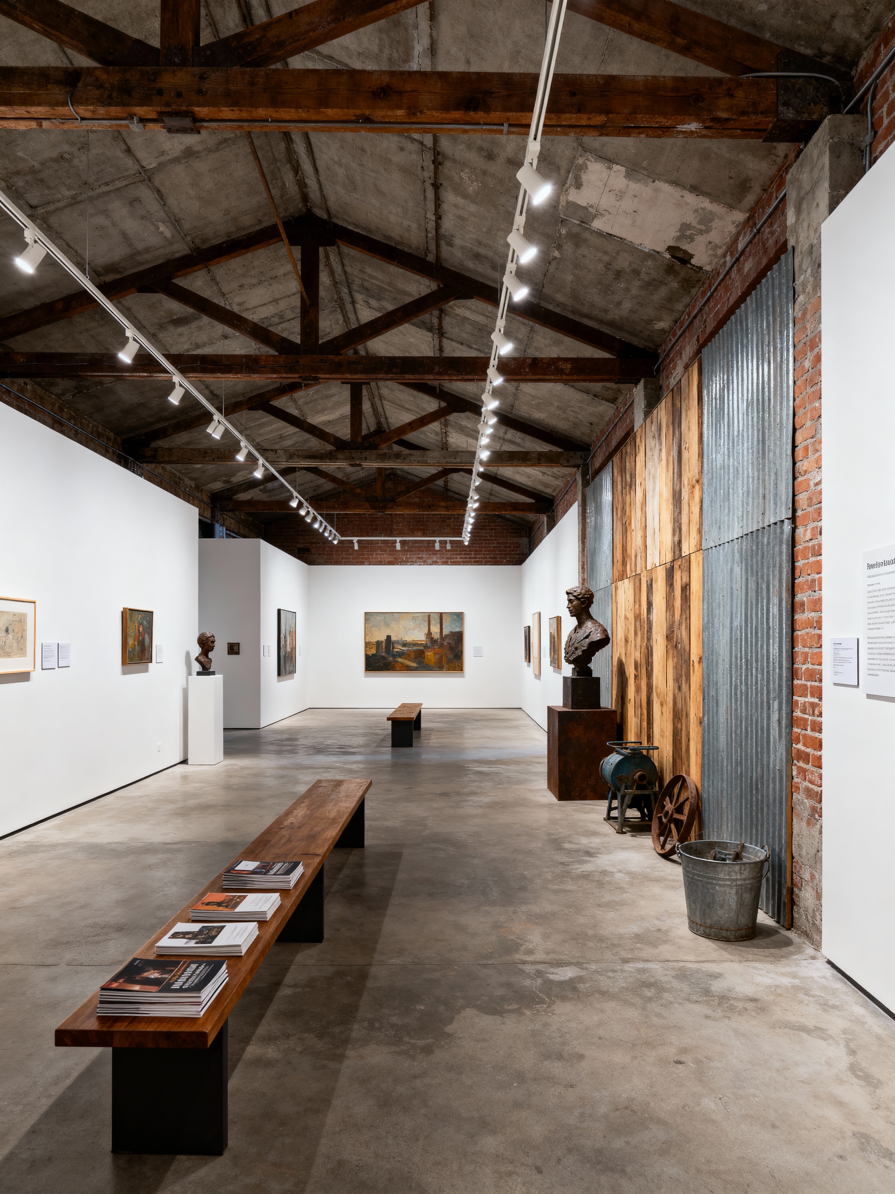 gallery with industrial style with benches and exhibition catalogs and artwork and information plaques and white walls and sculptures and paintings and track lighting. . with utilitarian objects and open floorplan and factory style and reclaimed wood and metal panels and exposed brick and exposed concrete and exposed rafters