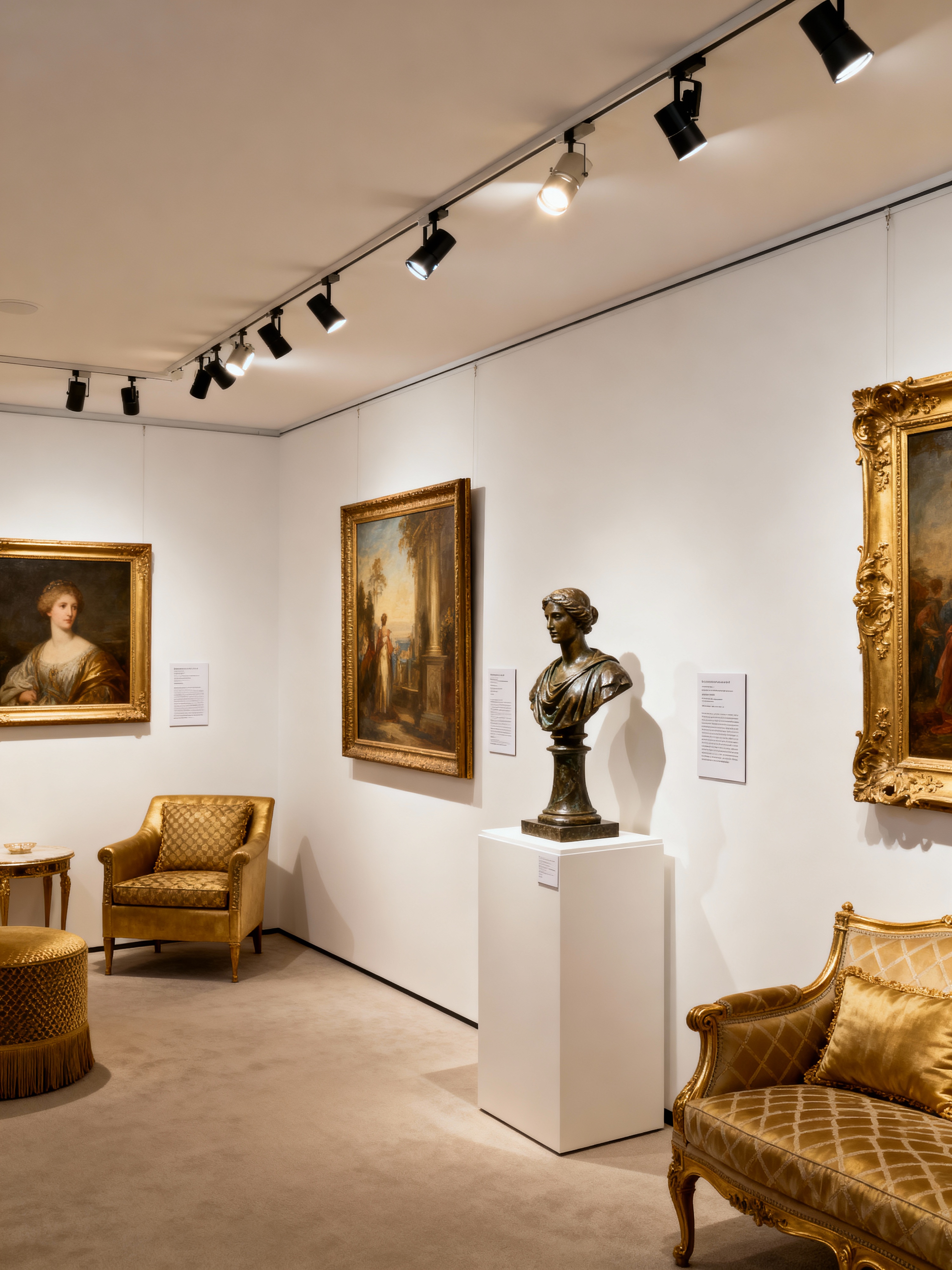 gallery with luxury style with artwork and paintings and pedestals and track lighting and sculptures and information plaques and white walls and spotlights. . with rich textures and elegant lighting and high-end materials and sophisticated style and exclusive design and lavish comfort and designer furniture and premium finishes