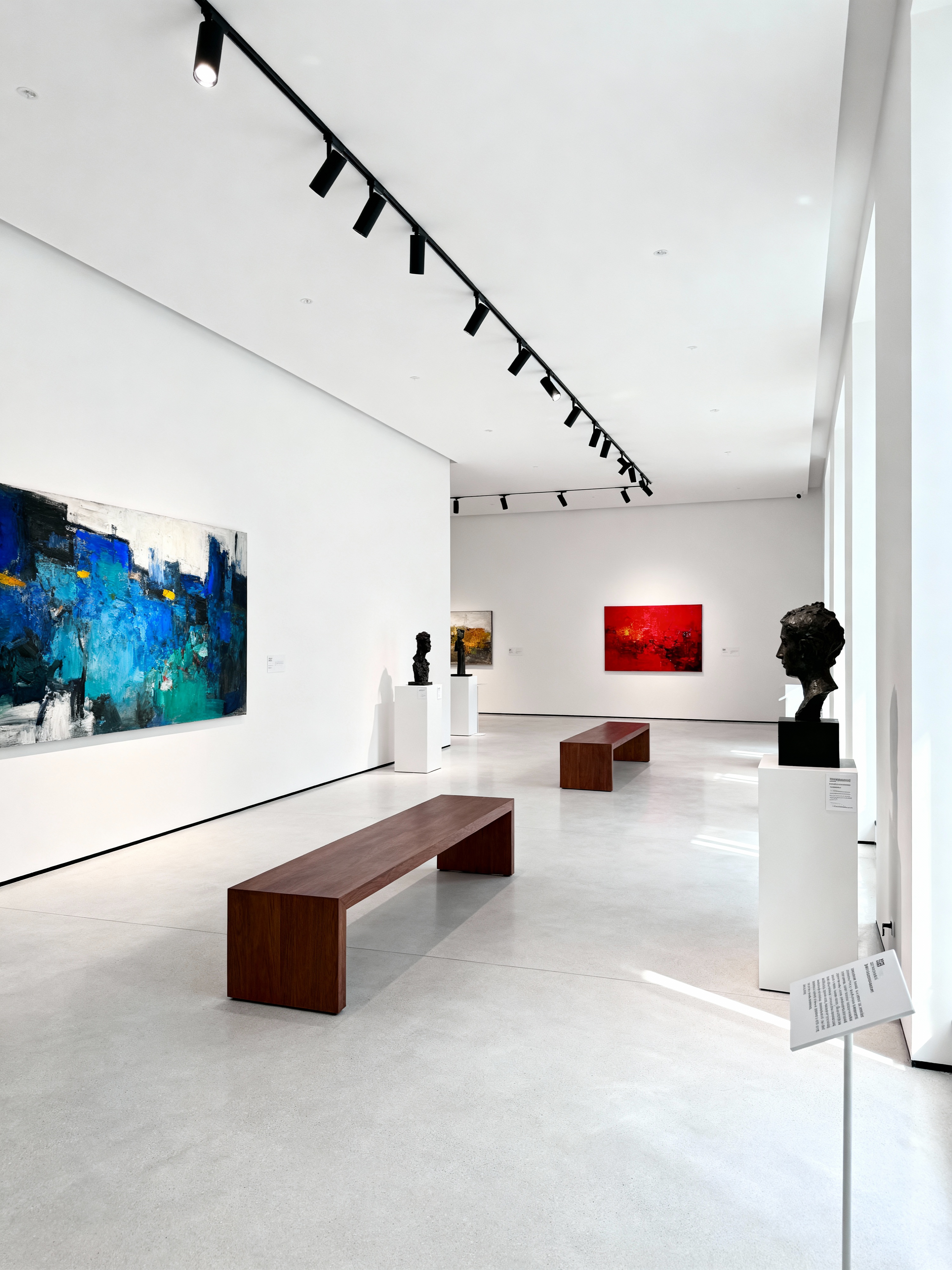 gallery with minimalist style with artwork and track lighting and information plaques and sculptures and spotlights and benches and paintings and white walls. . with lots of light and focus on the shape, colour and texture of just a few of essential elements and functional furniture and a monochromatic palette with colour used as an accent and clean lines and an open floor plan and lots of light