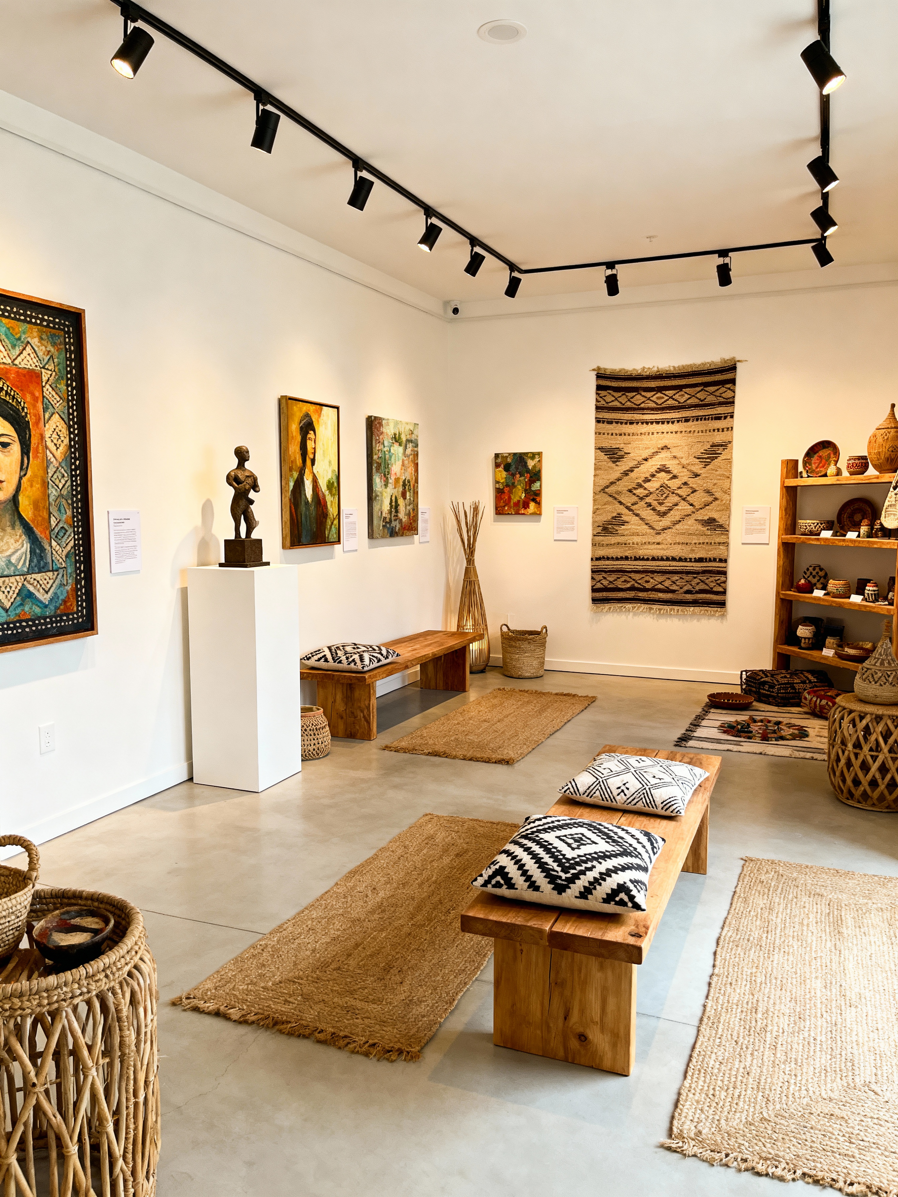 gallery with modern boho style with white walls and artwork and pedestals and paintings and information plaques and spotlights and benches and sculptures. . with patterns and handcrafted items and wood decor and airy space and natural materials and jute rugs and bohemian style and cozy feel