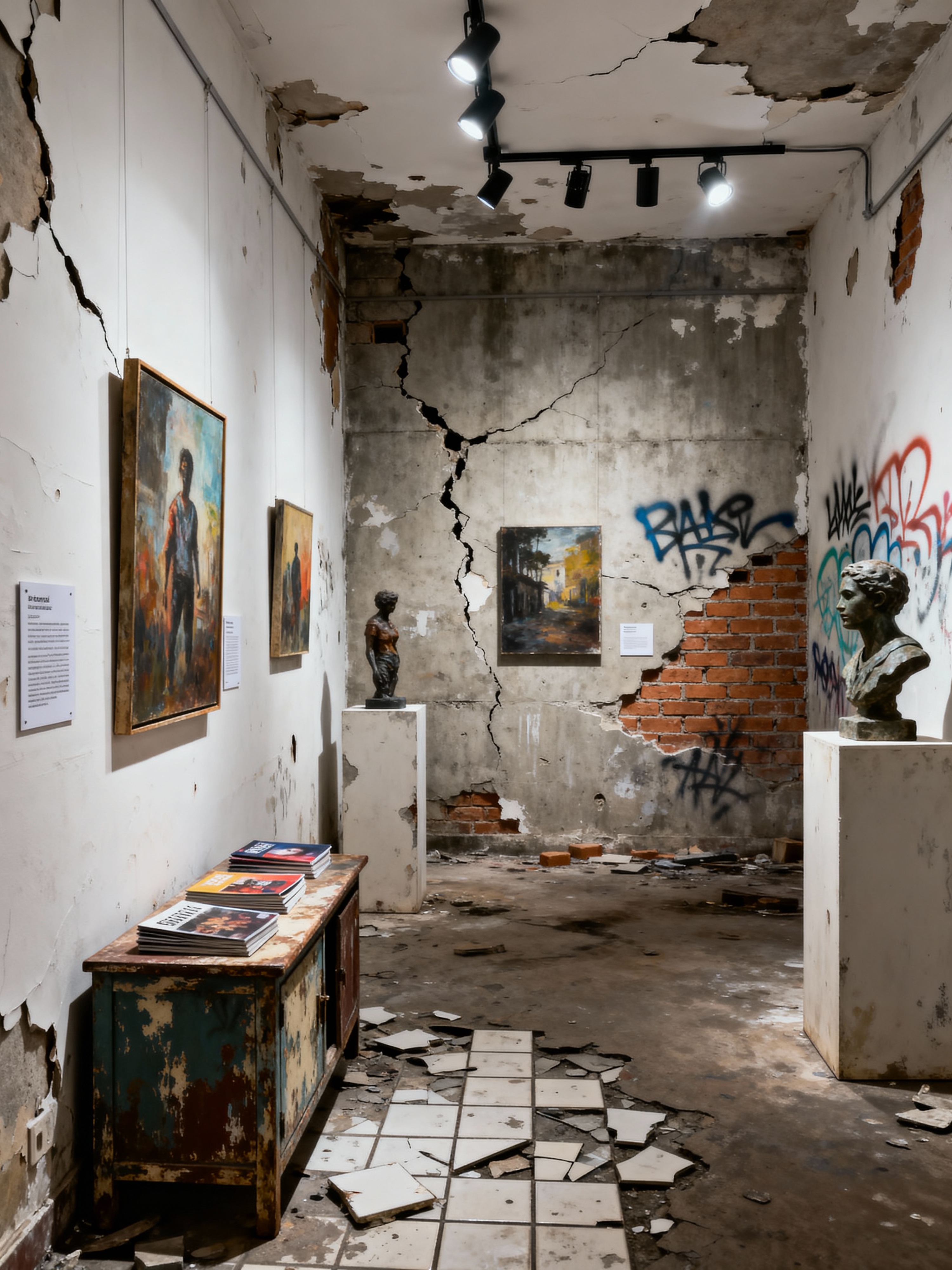 gallery with post-apocalyptic style with paintings and sculptures and exhibition catalogs and pedestals and information plaques and track lighting and white walls and spot . . with distressed furniture and peeling paint and cracked concrete walls and graffiti on walls and run-down favela style and broken tiles and survival-inspired and exposed bricks