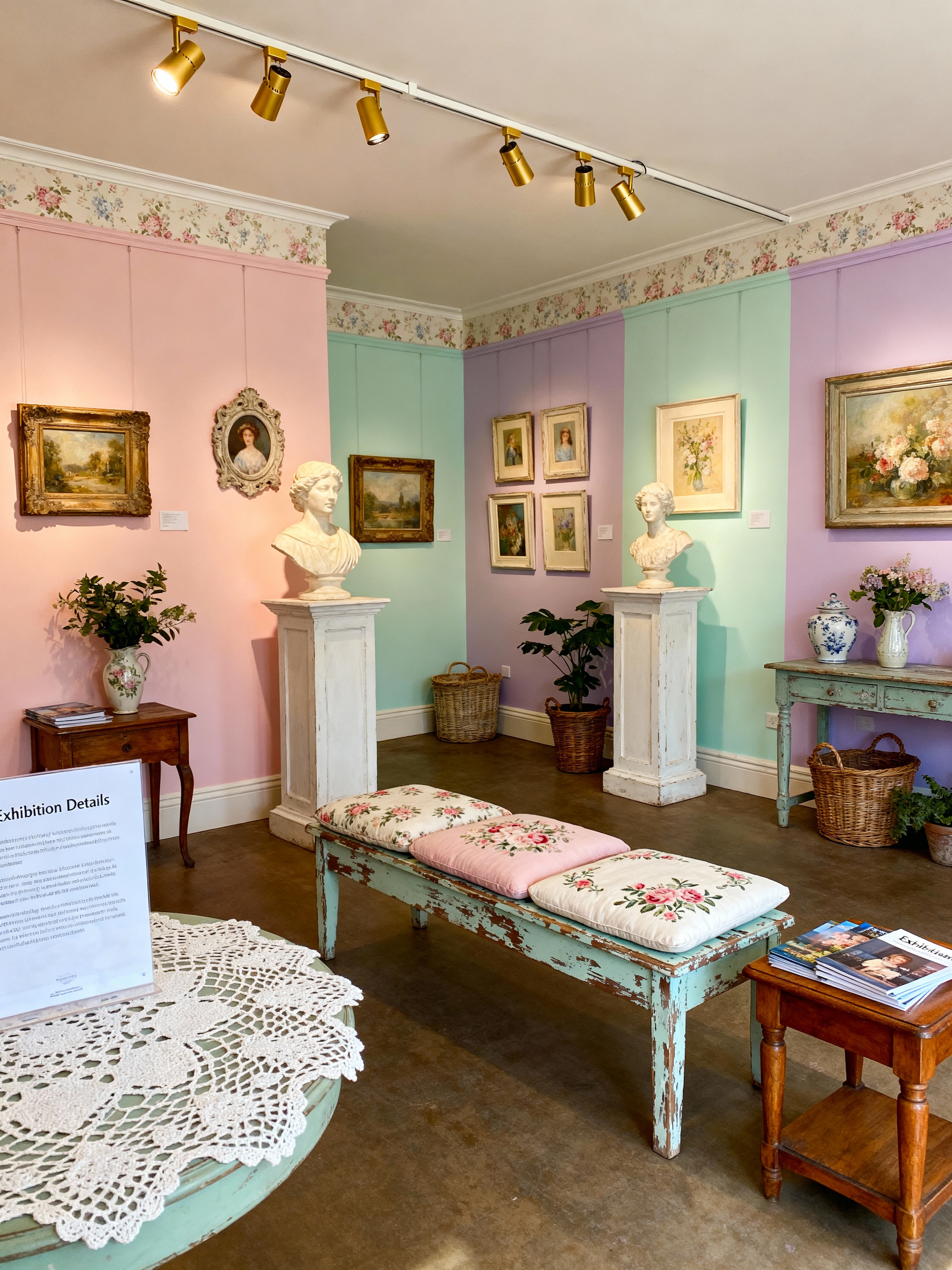 gallery with shabby chic style with artwork and sculptures and pedestals and benches and information plaques and exhibition catalogs and spotlights and track lighting. . with feminine touches and delicate details and cottage feel and antique lace and vintage charm and distressed furniture and pastel colors and floral patterns