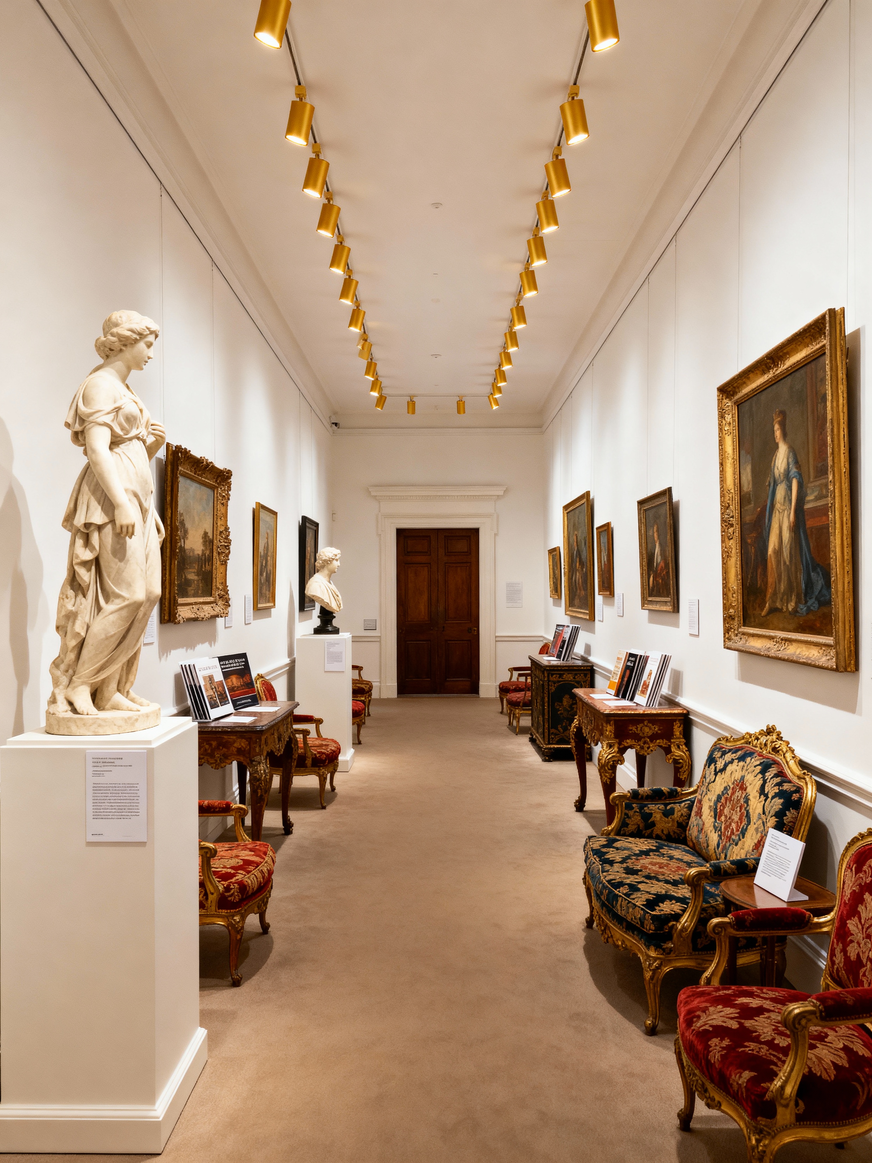 gallery with traditional style with pedestals and exhibition catalogs and information plaques and white walls and paintings and spotlights and sculptures and artwork. . with refined atmosphere and antique pieces and timeless design and formal furniture and ornate details and classic elegance and symmetrical layout and rich fabrics