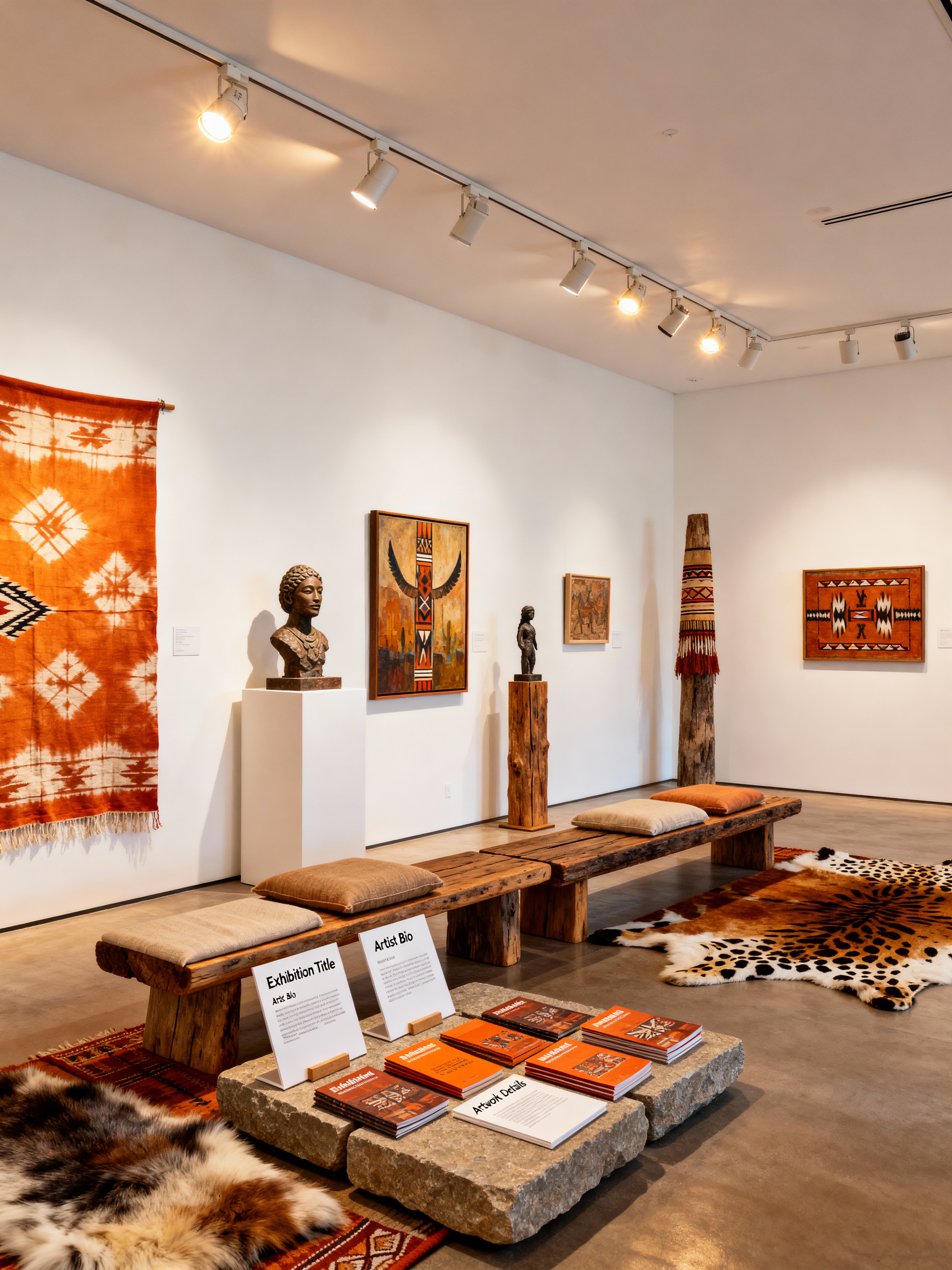 gallery with tribal style with track lighting and sculptures and paintings and exhibition catalogs and artwork and white walls and information plaques and benches. . with hand dyed batik fabrics and smooth worn timbers and animal prints and tribal revival and desert colours and planks of stone and animal furslinen and sculptures and artworks