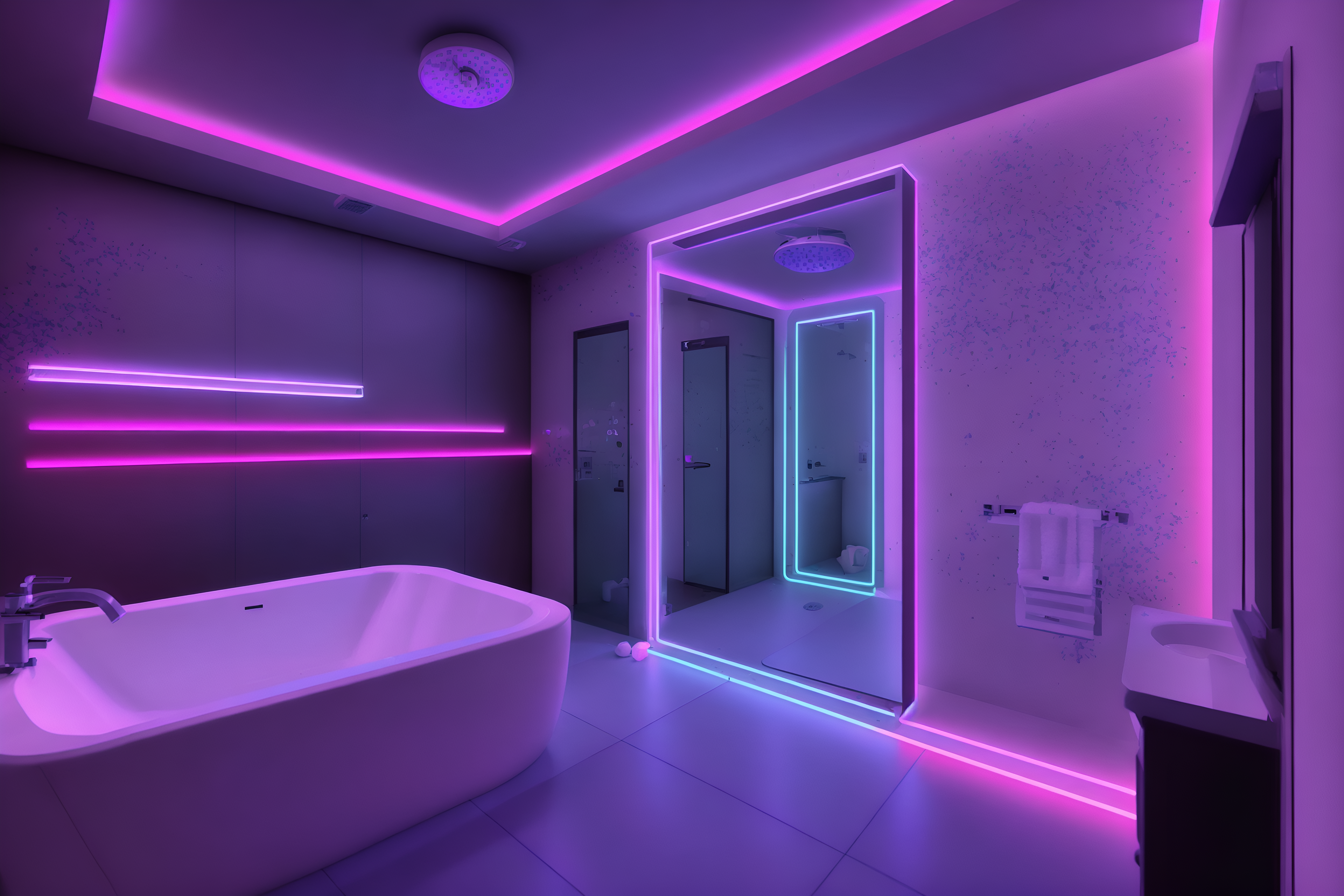 photo from pinterest of gaming room-style interior designed (bathroom interior) with bathtub and bath towel and bathroom cabinet and bathroom sink with faucet and mirror and bath rail and toilet seat and plant. . with purple, red and blue fade light and speakers and gaming chair and neon letters on wall and at night and multiple displays and neon lights and purple and red lights. . cinematic photo, highly detailed, cinematic lighting, ultra-detailed, ultrarealistic, photorealism, 8k. trending on pinterest. gaming room interior design style. masterpiece, cinematic light, ultrarealistic+, photorealistic+, 8k, raw photo, realistic, sharp focus on eyes, (symmetrical eyes), (intact eyes), hyperrealistic, highest quality, best quality, , highly detailed, masterpiece, best quality, extremely detailed 8k wallpaper, masterpiece, best quality, ultra-detailed, best shadow, detailed background, detailed face, detailed eyes, high contrast, best illumination, detailed face, dulux, caustic, dynamic angle, detailed glow. dramatic lighting. highly detailed, insanely detailed hair, symmetrical, intricate details, professionally retouched, 8k high definition. strong bokeh. award winning photo.